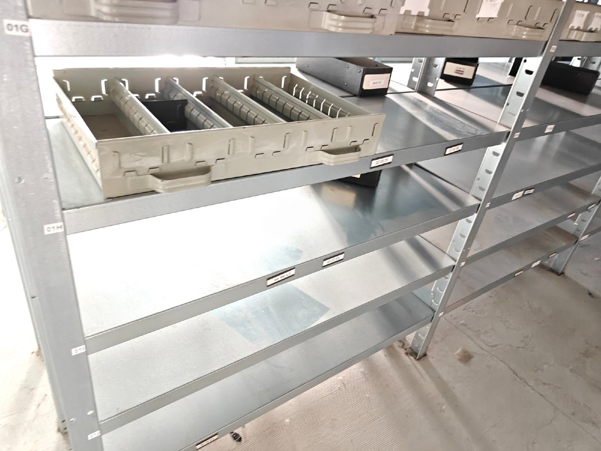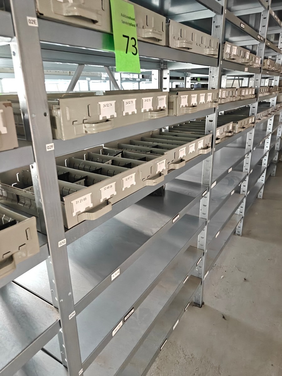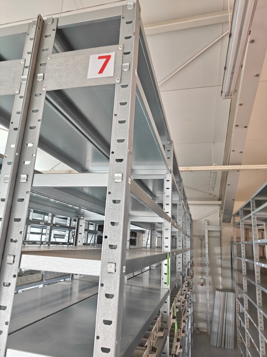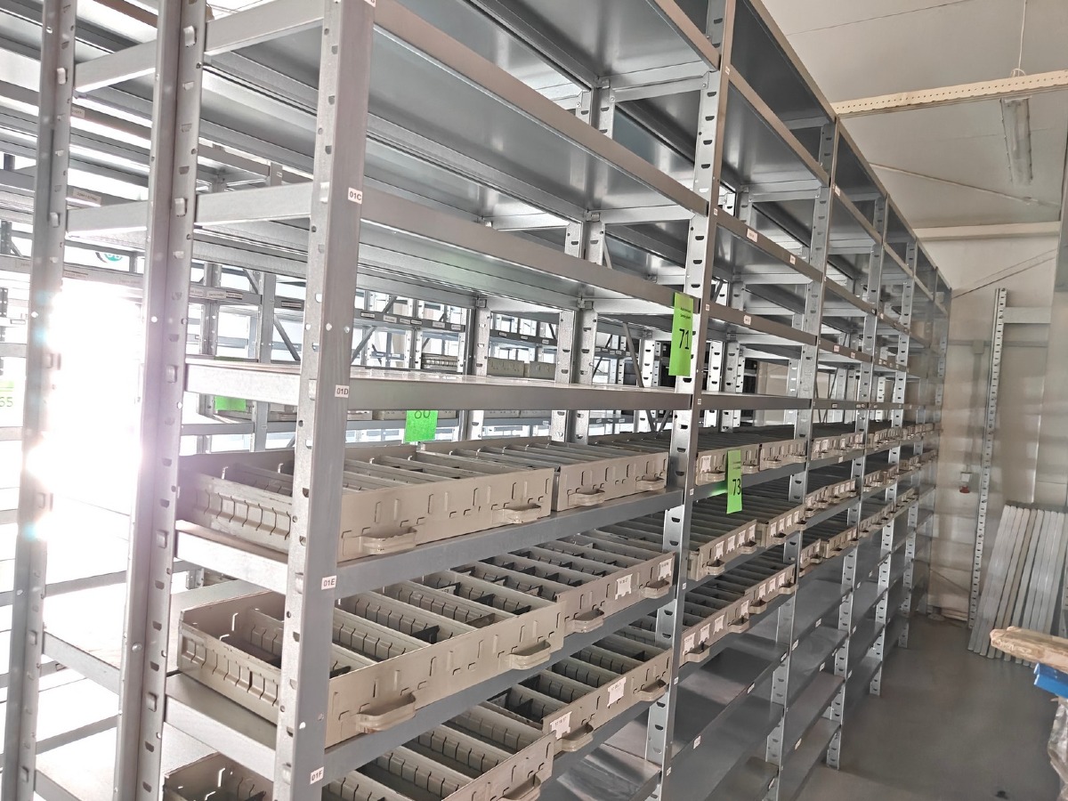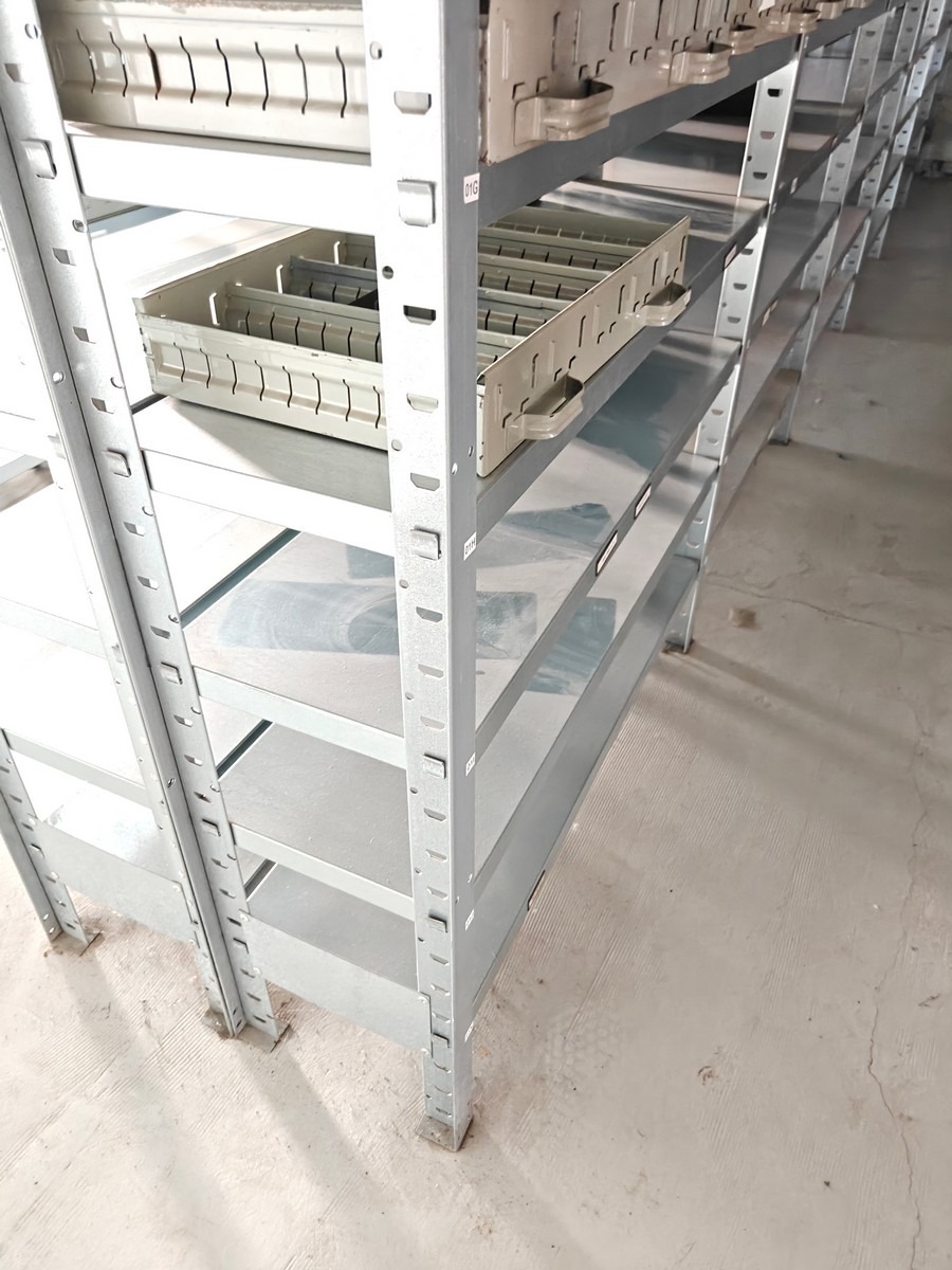 Værkstedsreoler med 6 fag. Hver fag måler ca: 104 x 30 x 250 cm. Uden indhold. Køber skal selv afmontere.