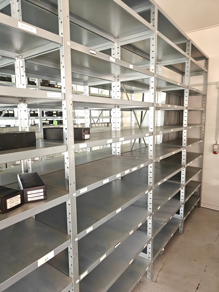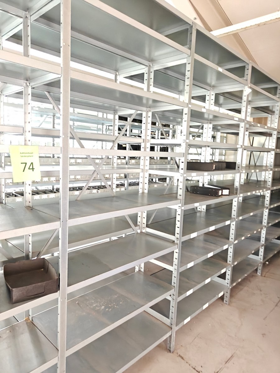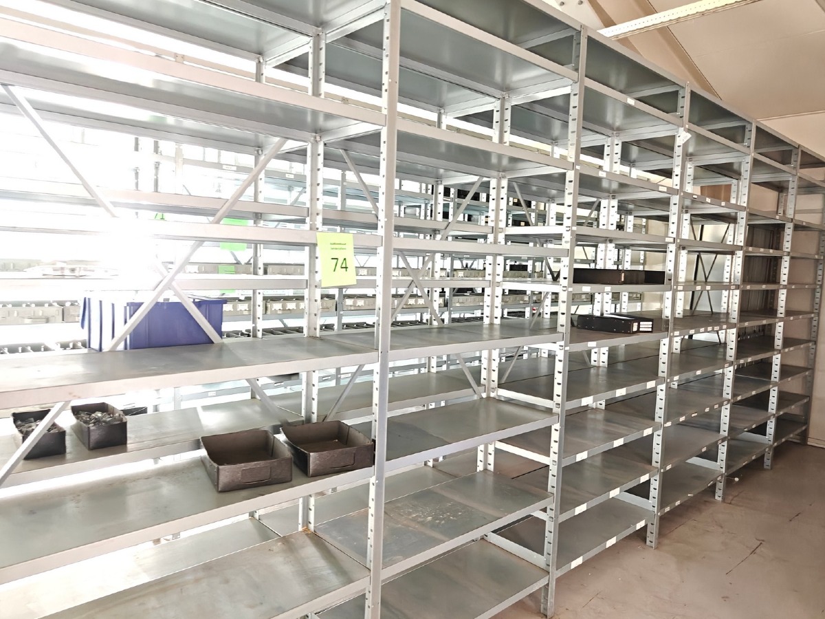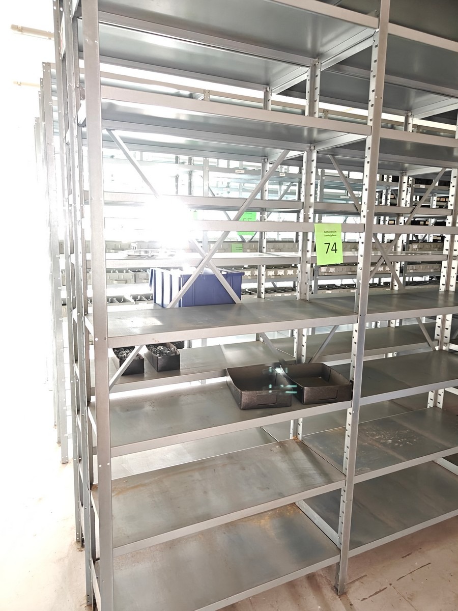 Værkstedsreoler med 6 fag. Hver fag måler ca: 104 x 40 x 250 cm. Uden indhold. Køber skal selv afmontere.