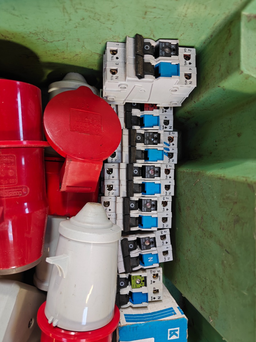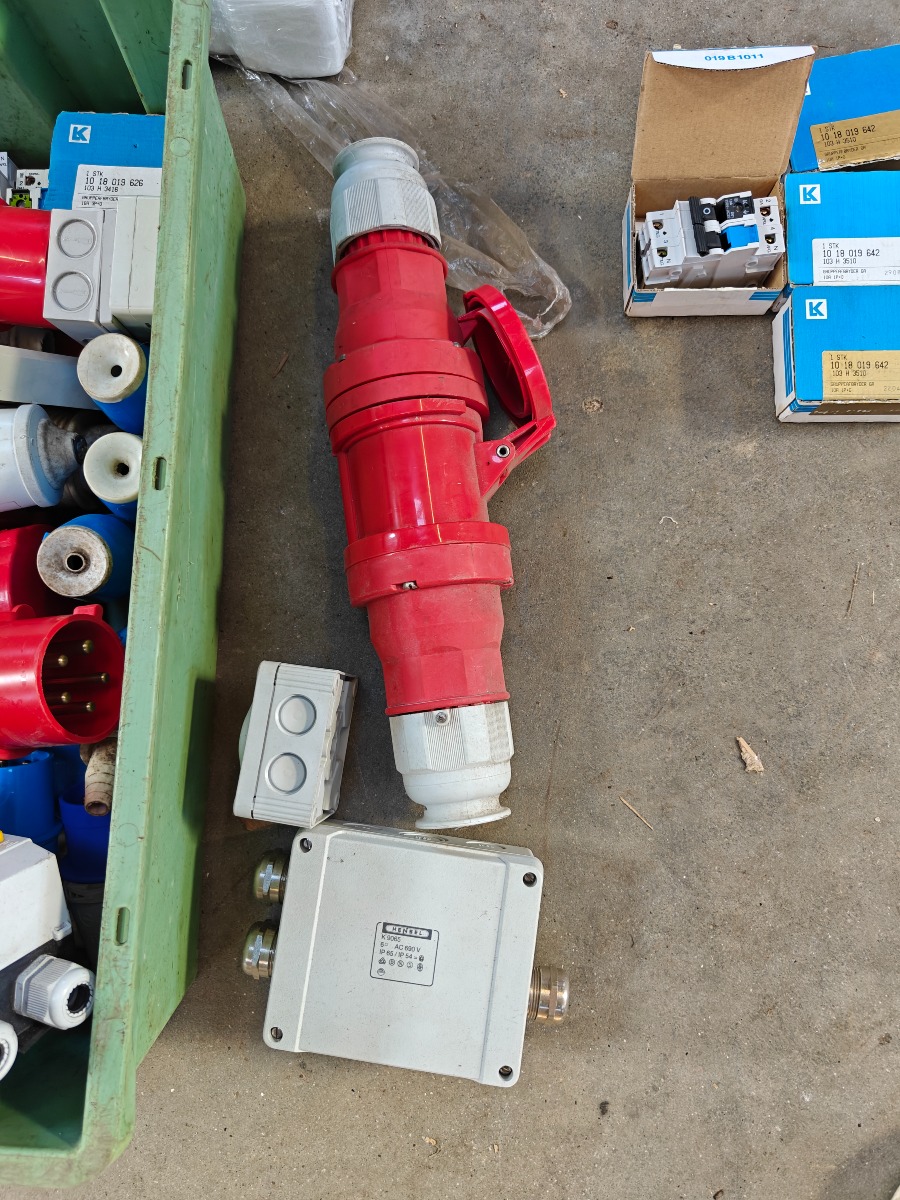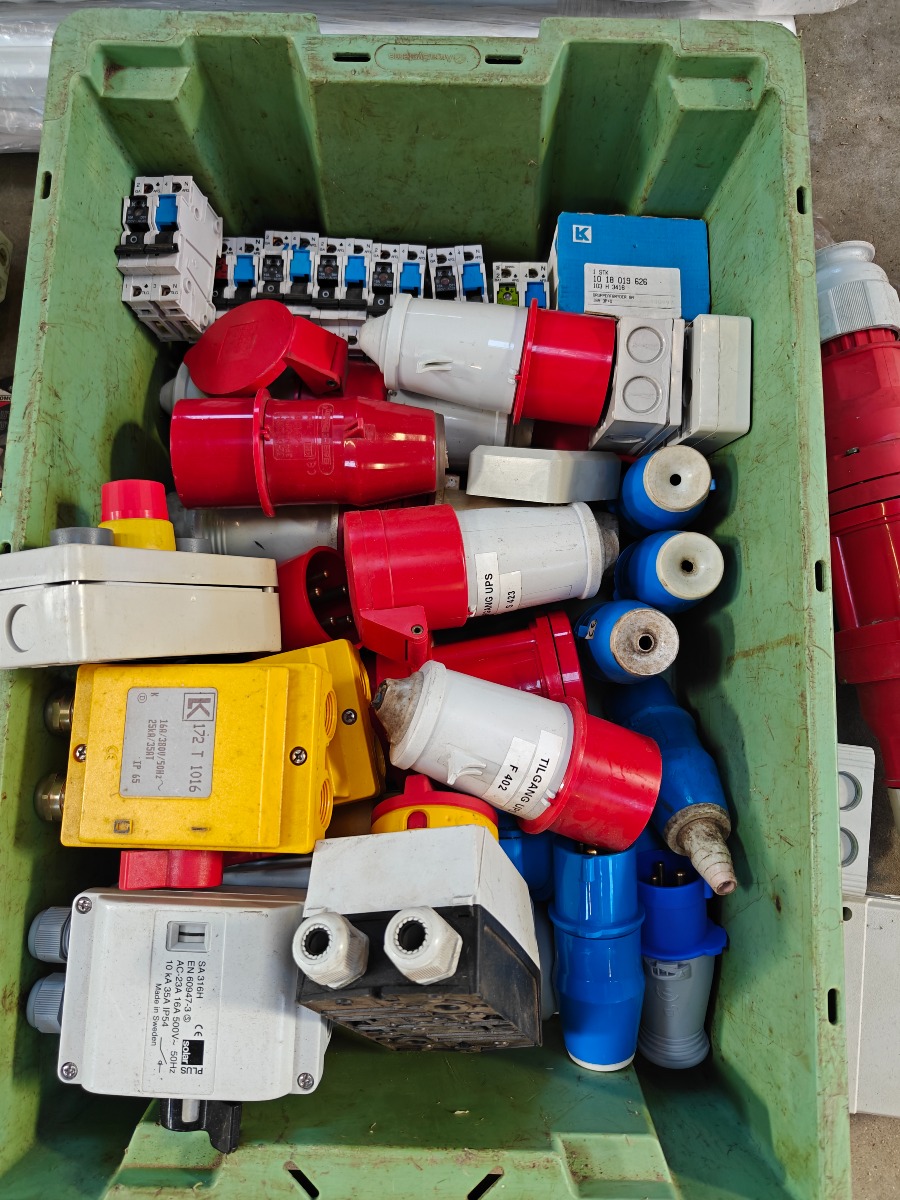 Parti elartikler, tom eltavler, 6 stk sikkerhedsafbrydere, div cee stik 4 stk gruppe afbrydere 10 amp. ubrugte, 7 stk gruppeafbrydere 10amp. brugte og 2 stk afisoleringstænger