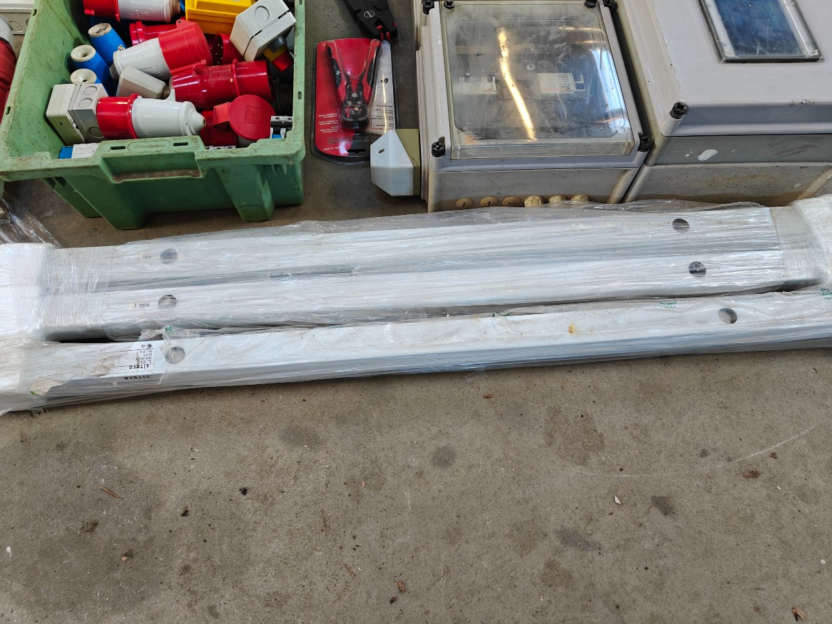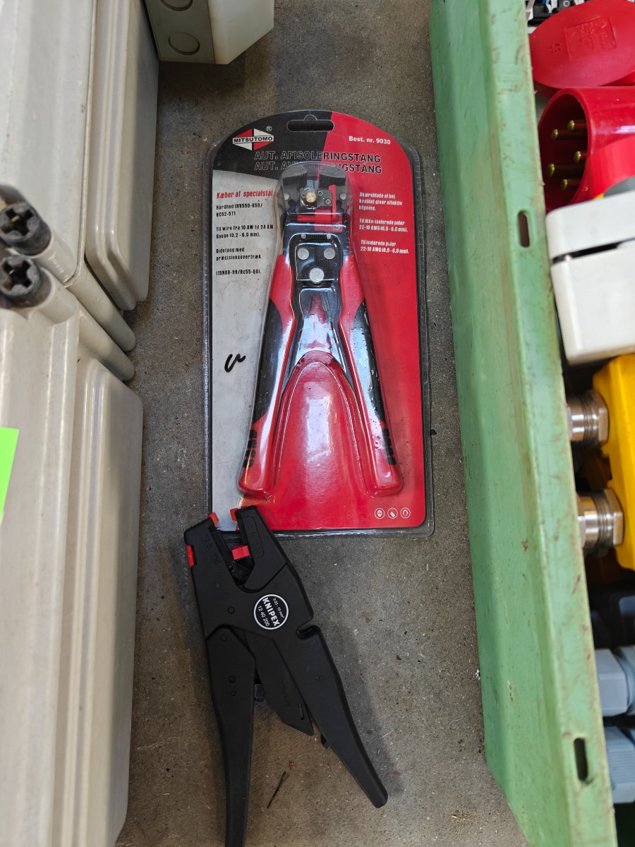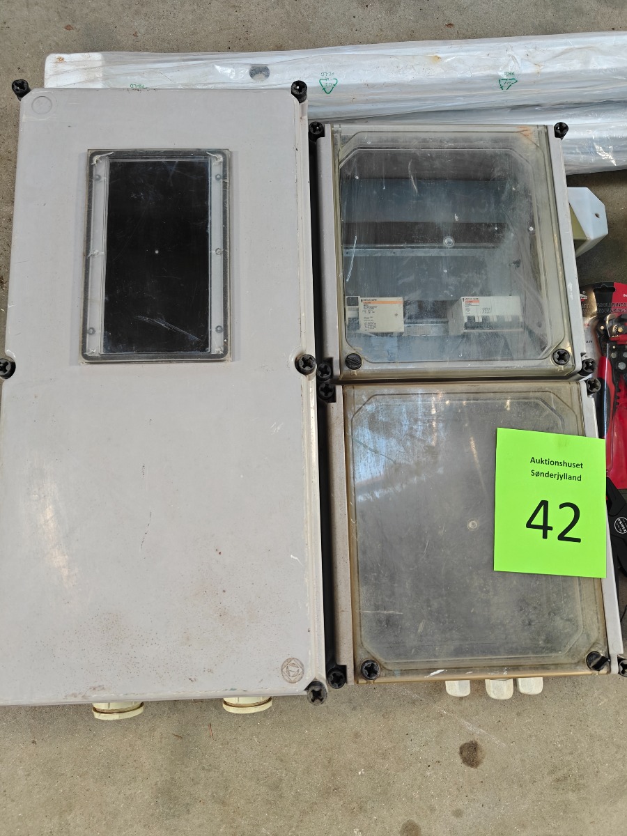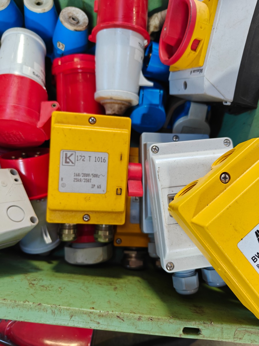 Parti elartikler, tom eltavler, 6 stk sikkerhedsafbrydere, div cee stik 4 stk gruppe afbrydere 10 amp. ubrugte, 7 stk gruppeafbrydere 10amp. brugte og 2 stk afisoleringstænger