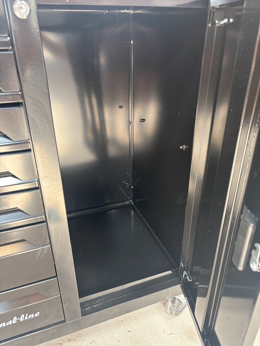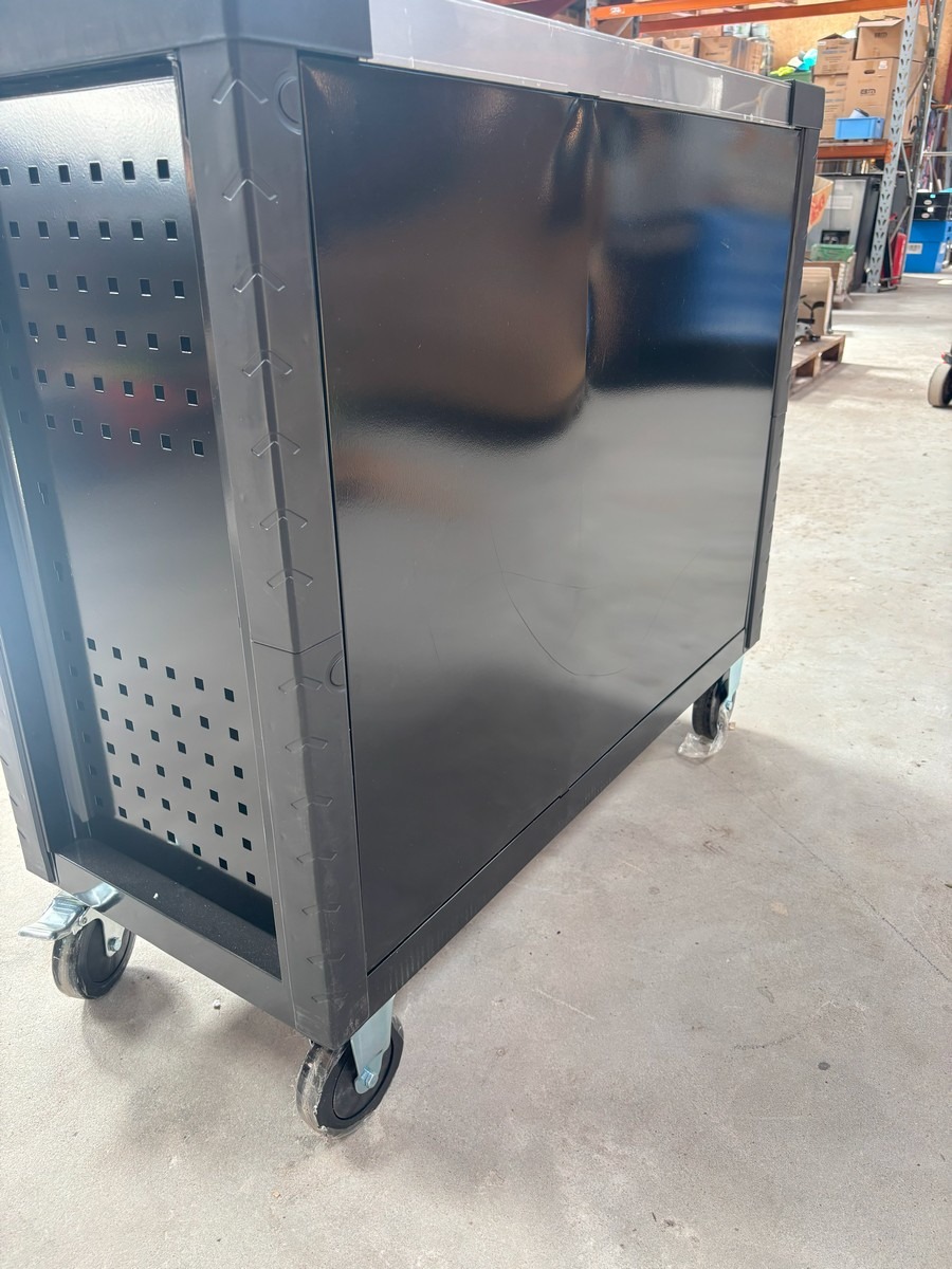 XXL Værktøjsvogn, med masser af værktøj i. Værktøj i alle 7 af skufferne. Der medfølger hjul der kan monteres på den, så den er nem at transportere frem og tilbage - disse ligger i skuffe 7. Måler : 115 x 48 x 85 cm. Ubrugt, dog demo model og med en lille bule omme bagpå.