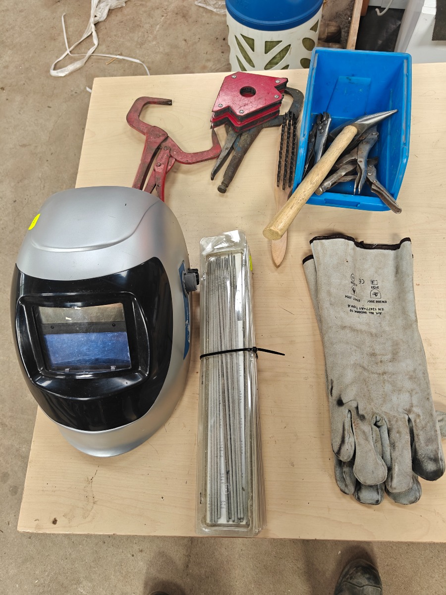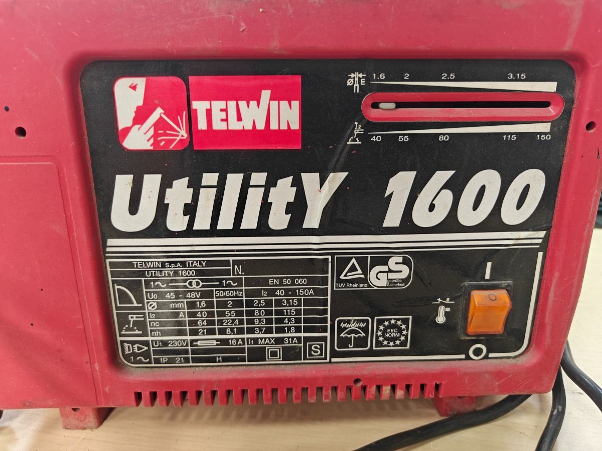 Telwin elektrode svejser Utility 1600, fuldautomatisk svejsehjelm, hansker elektroder oog div. tænger, brugt