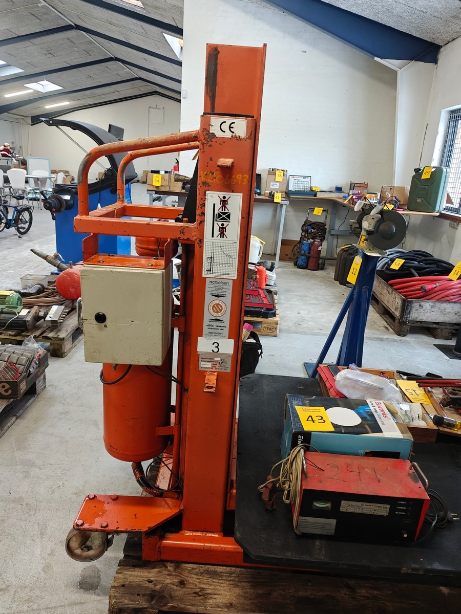Lufthydraulisk palleløfter. Mrk: IPL. Løftehøjde: ca 87 cm. Testet og virker ok. Arbejdsbord medfølger. Øvrige effekter medfølger ikke.