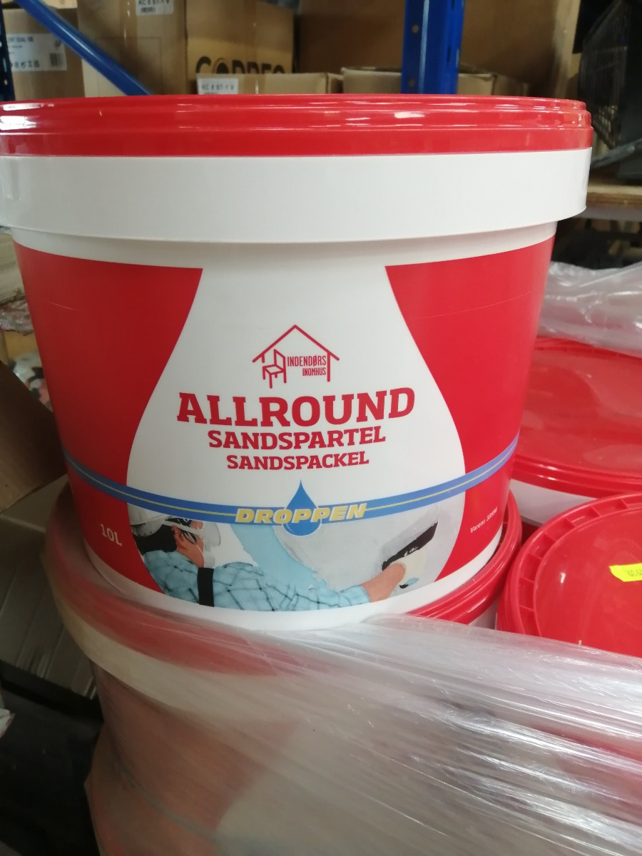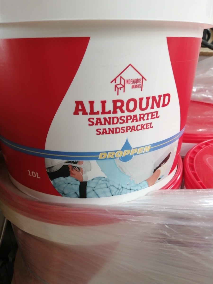 2 x 10 liter Droppen Sandspartel allround. Anvendes til plet-og fuldspartel i tørre rum. Spartelmassen indeholder lette medium fyldstoffer med god fyldeevne. Kan anvendes på puds, beton, letbeton, gips og tidligere malede overflader. Kan overmales med alle typer vandbaseret vægmaling. Ubrugt.
