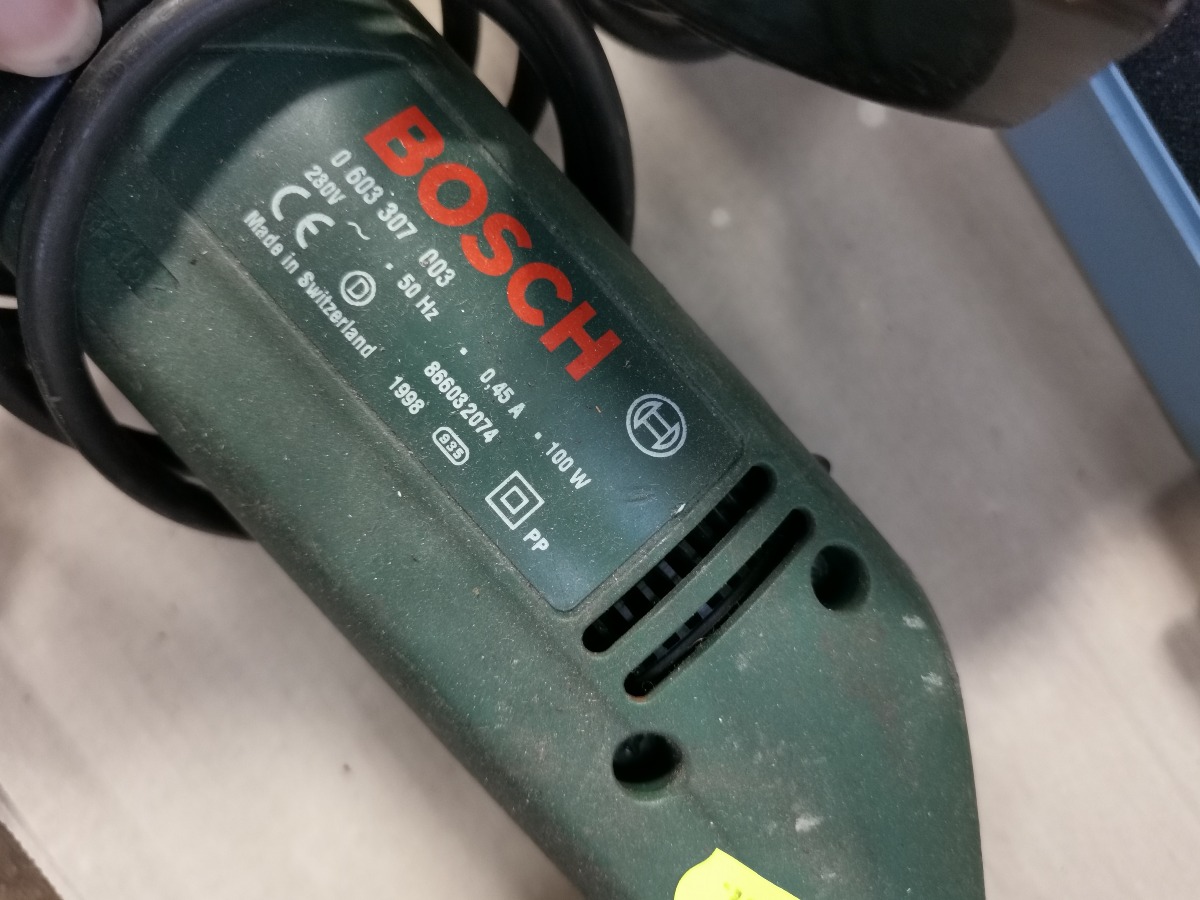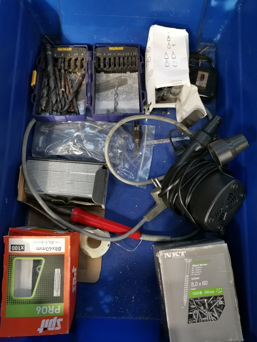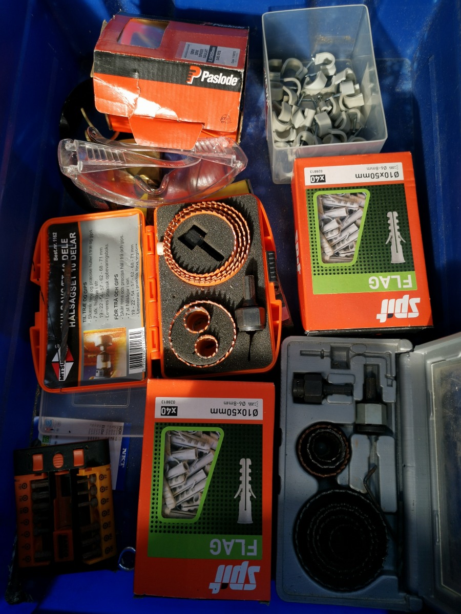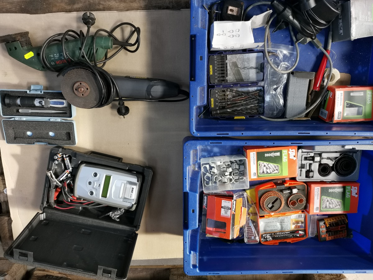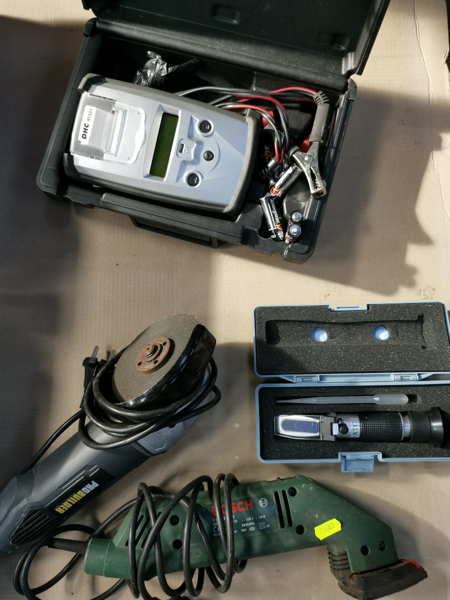 Batteritester, væsketester, eletrisk håndværktøj, bl.a. Bosch trekantsliber samt en del bor, hulbor m.m.