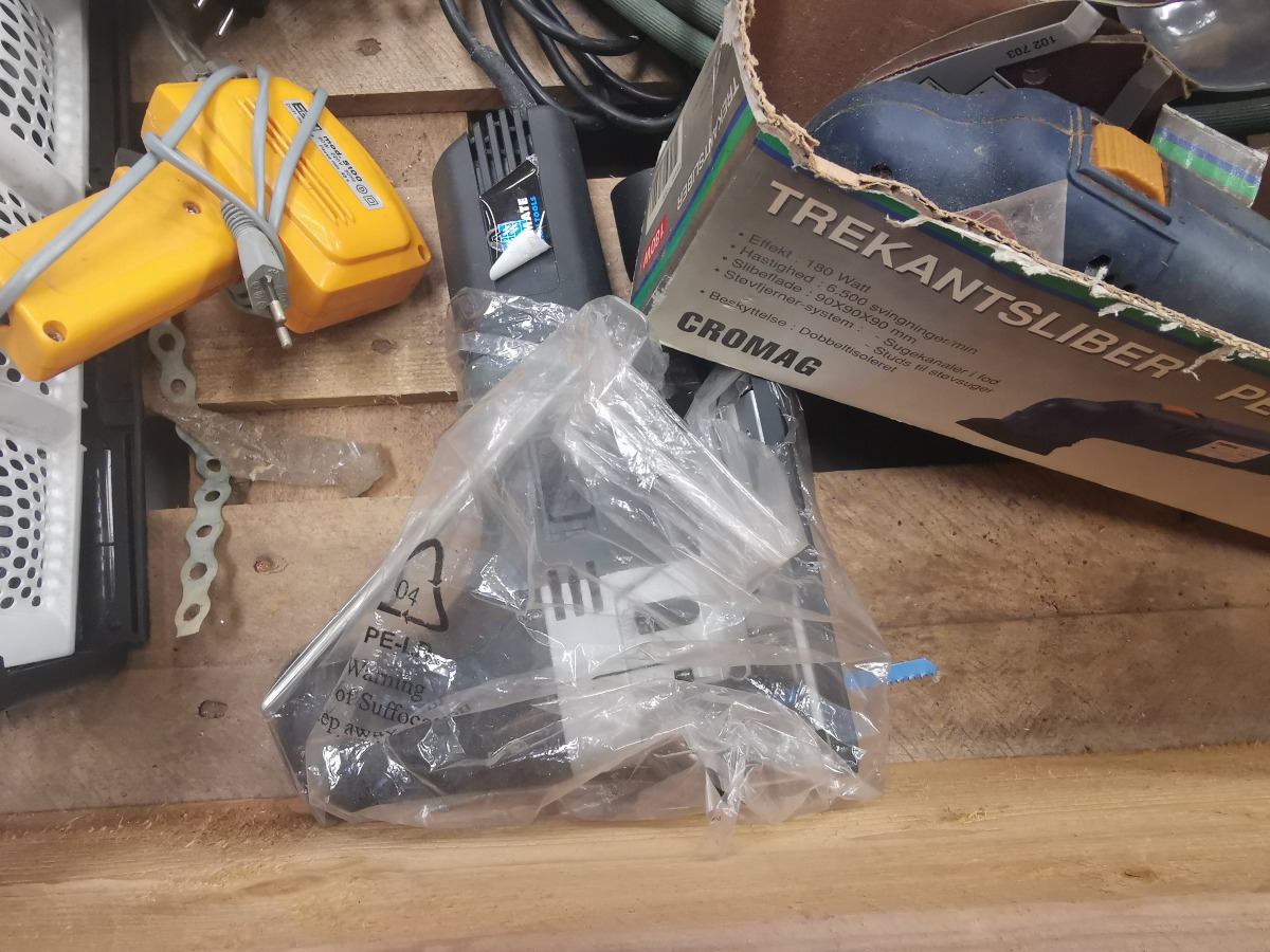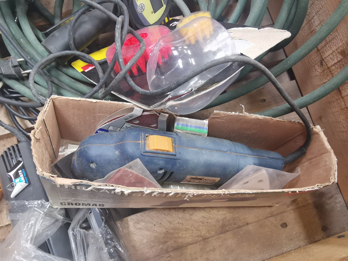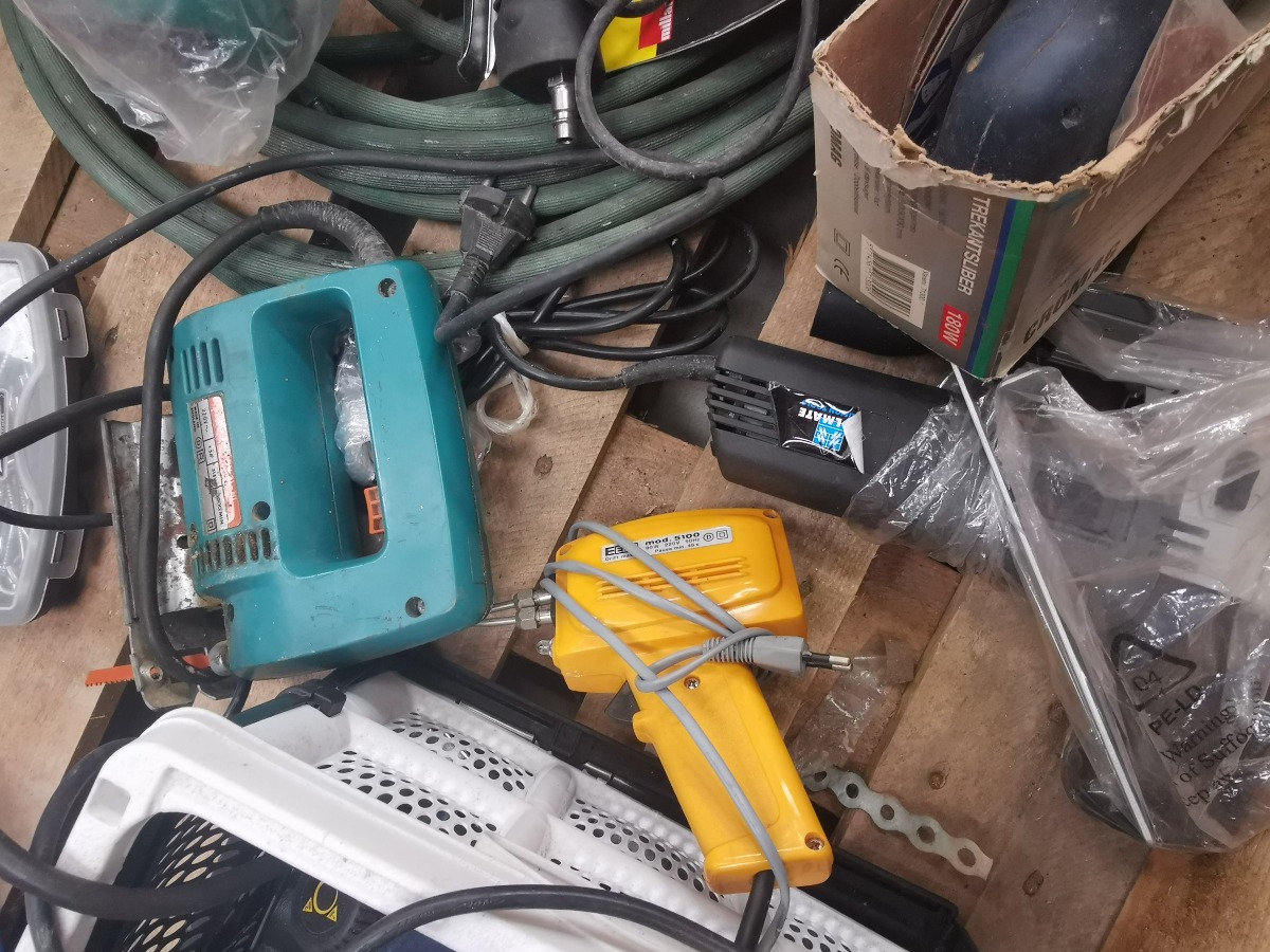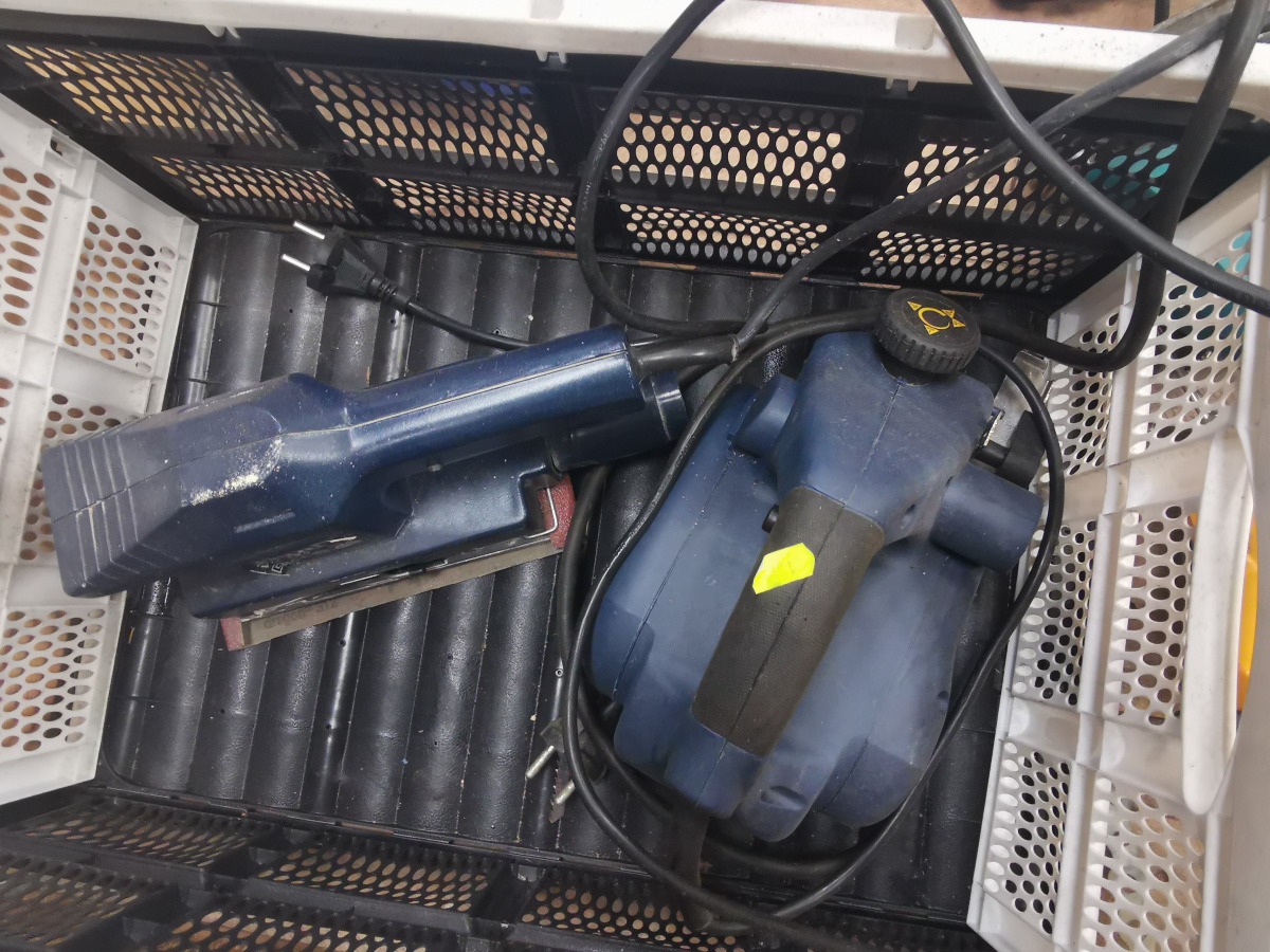 Forskelligt elværktøj. båndpudser, rystepudser, stiksave og luftpumper til kompressor.