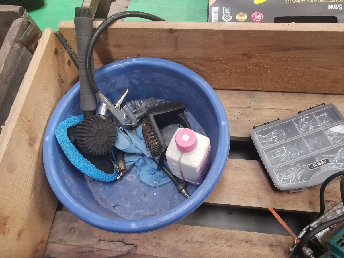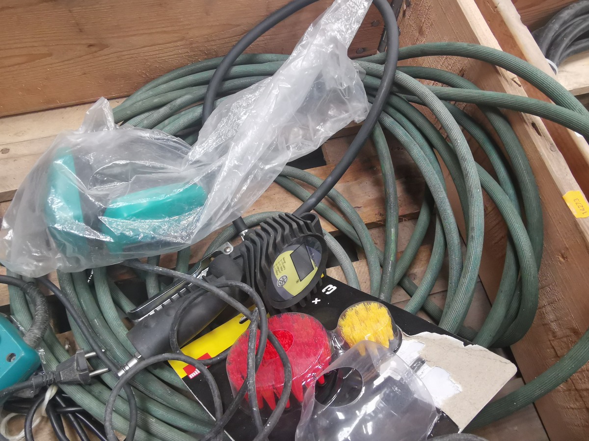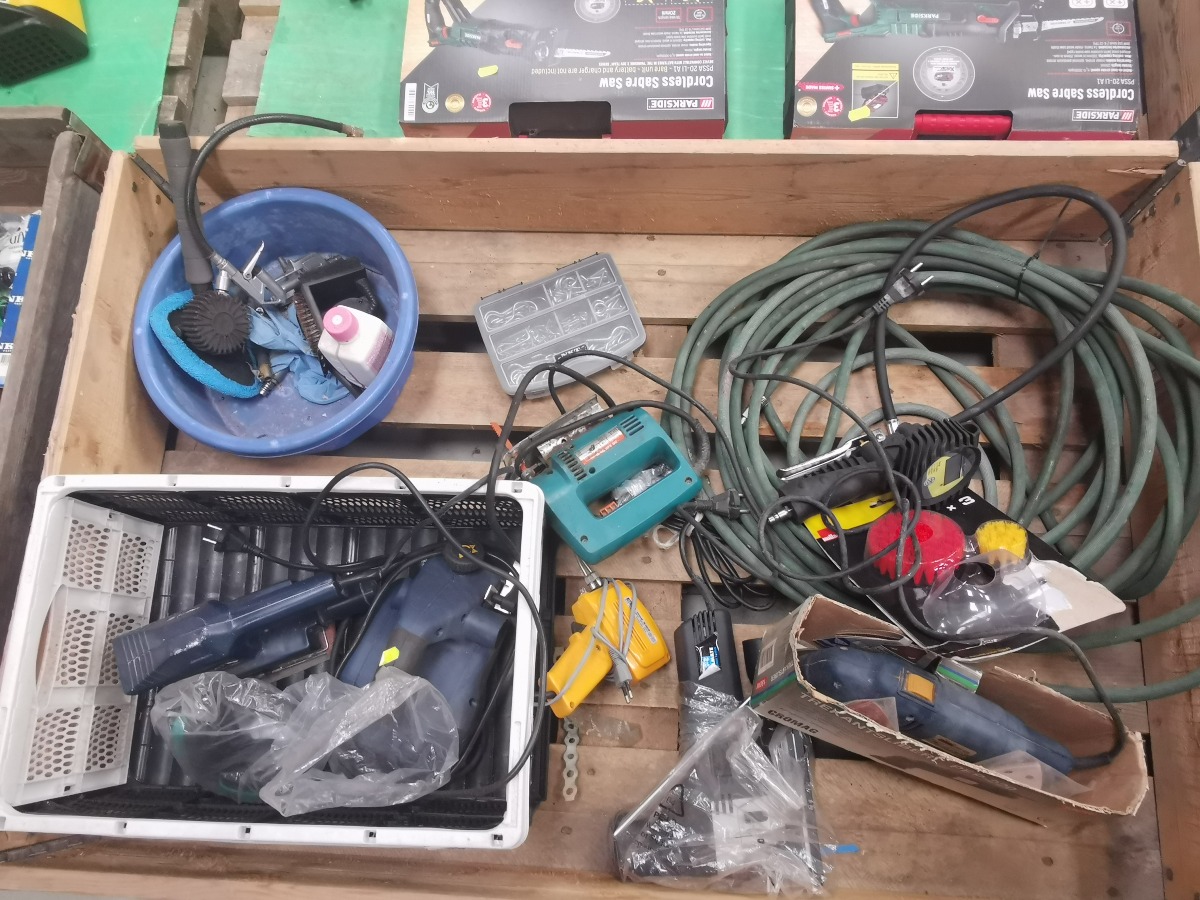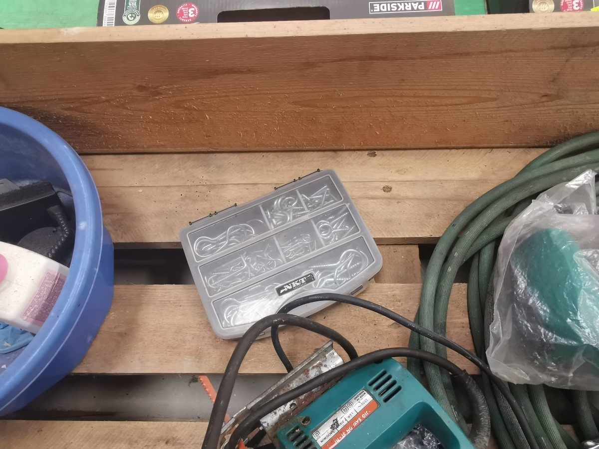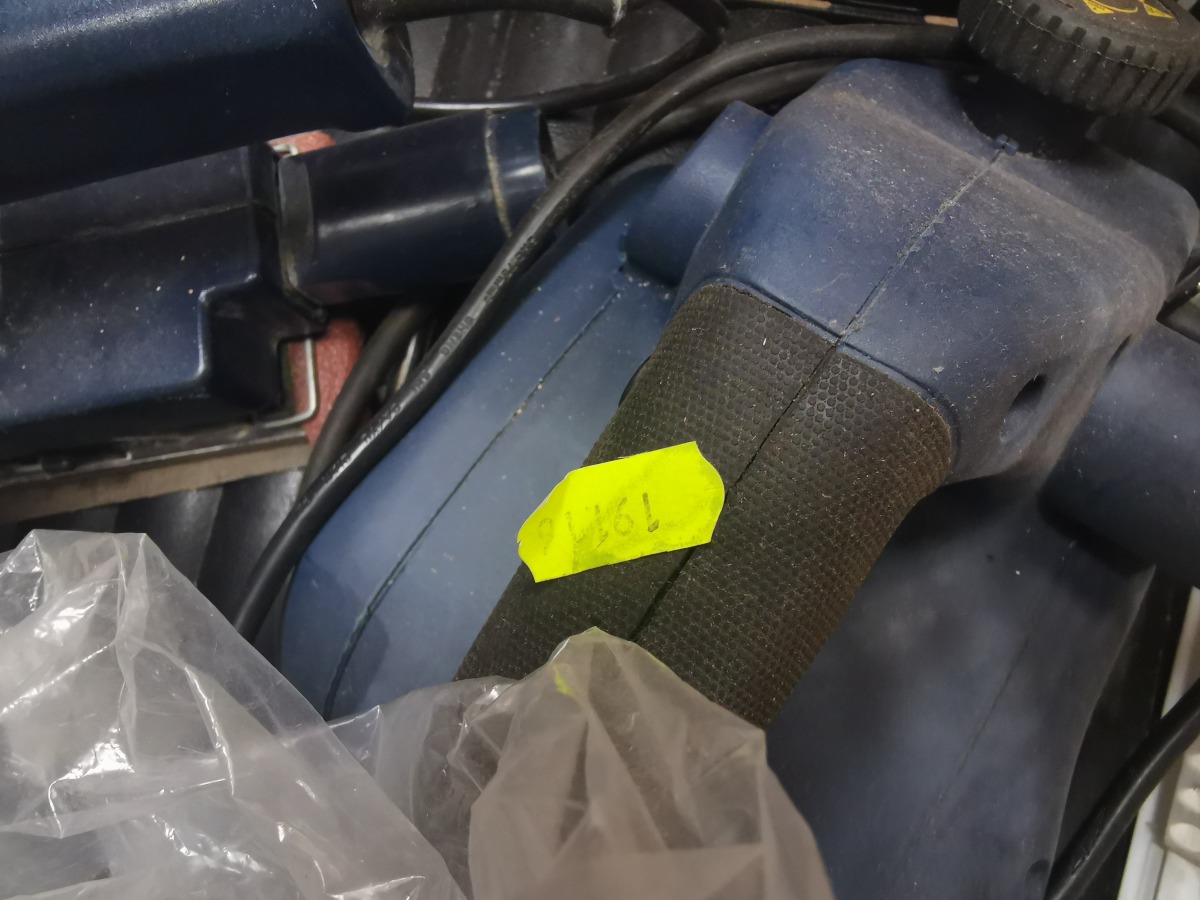 Forskelligt elværktøj. båndpudser, rystepudser, stiksave og luftpumper til kompressor.