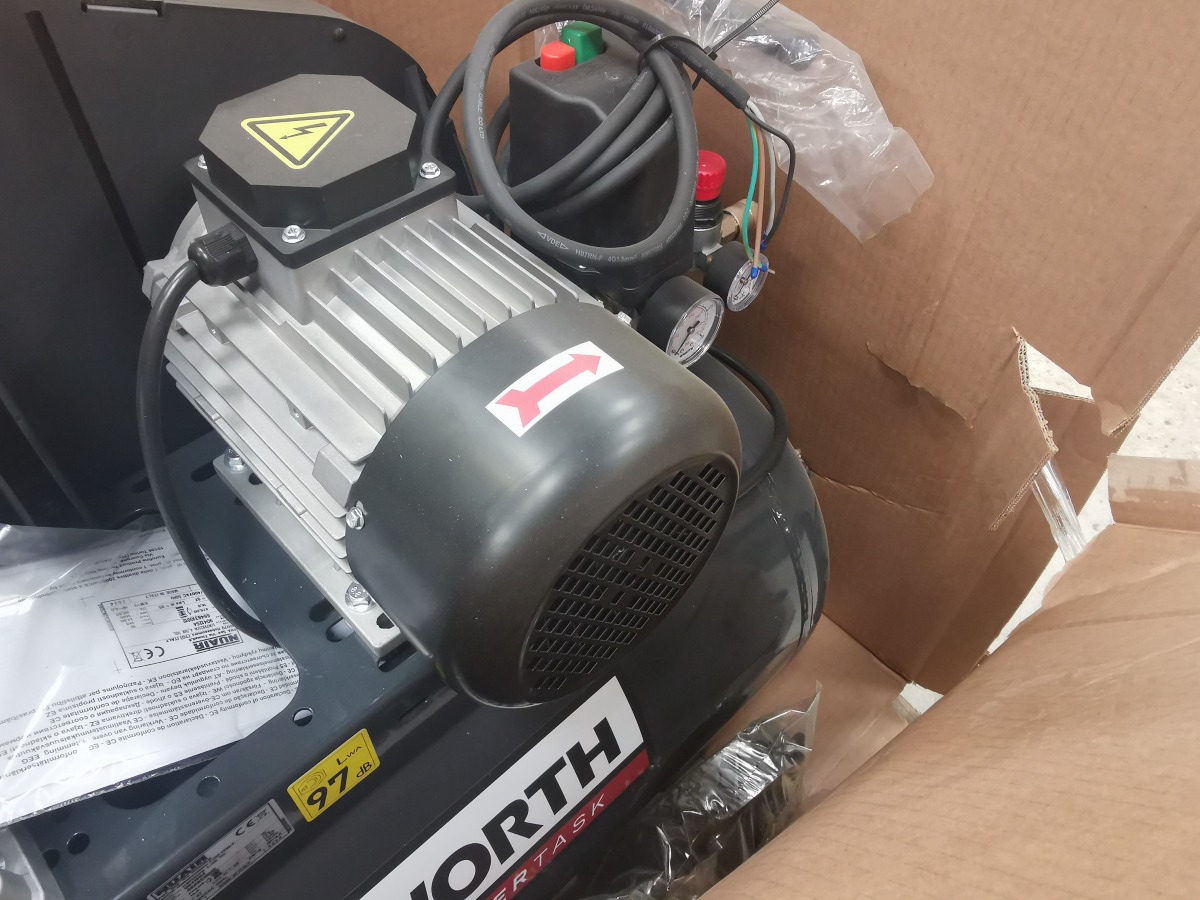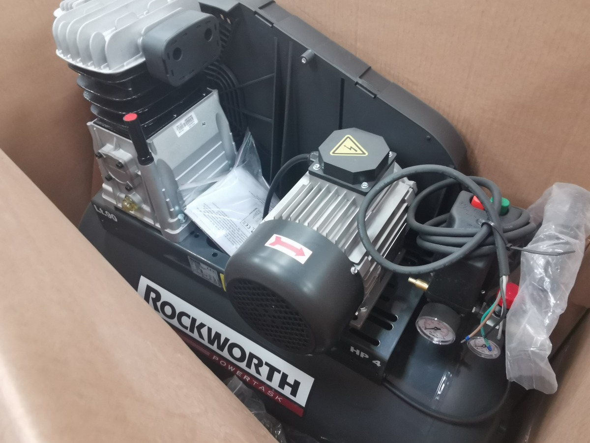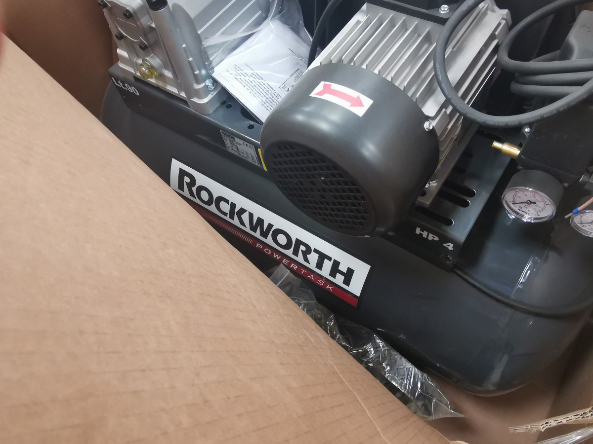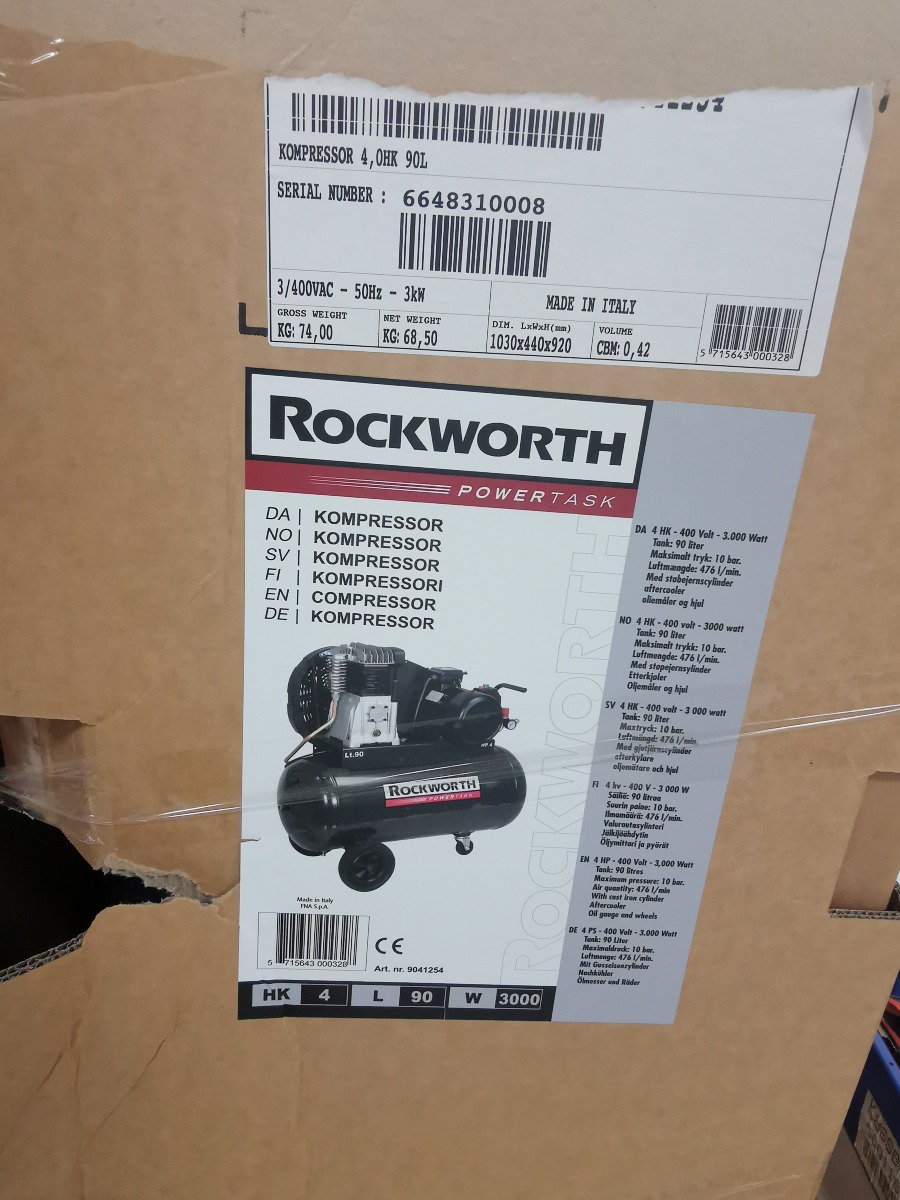 Rockworth kompressor. 90 l. tank og maksimalt tryk på 10 bar. Varen er ubrugt i anbrudt embalage.