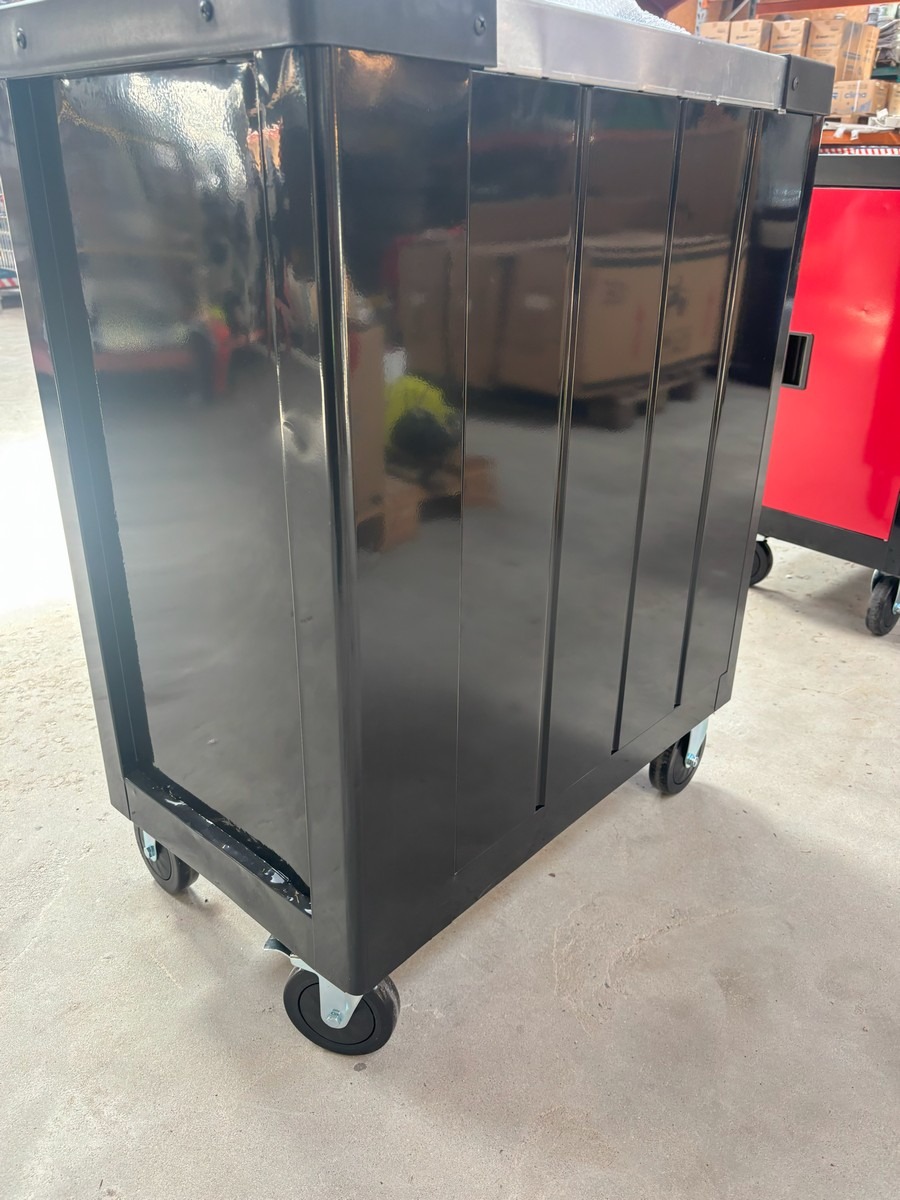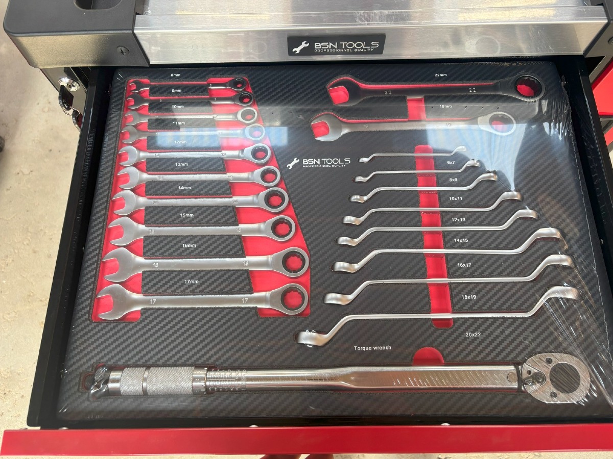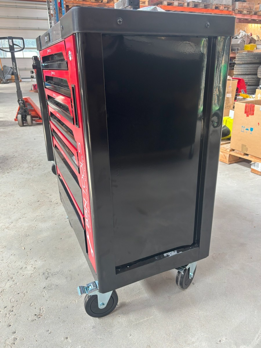 Værktøjsvogn, med masser af værktøj i. Værktøj i alle 7 af skufferne. Der medfølger hjul der kan monteres på den, så den er nem at transportere frem og tilbage - disse ligger i skuffe 7.  Ubrugt og i original emballage. Måler: 79 x 48 x 84 cm.