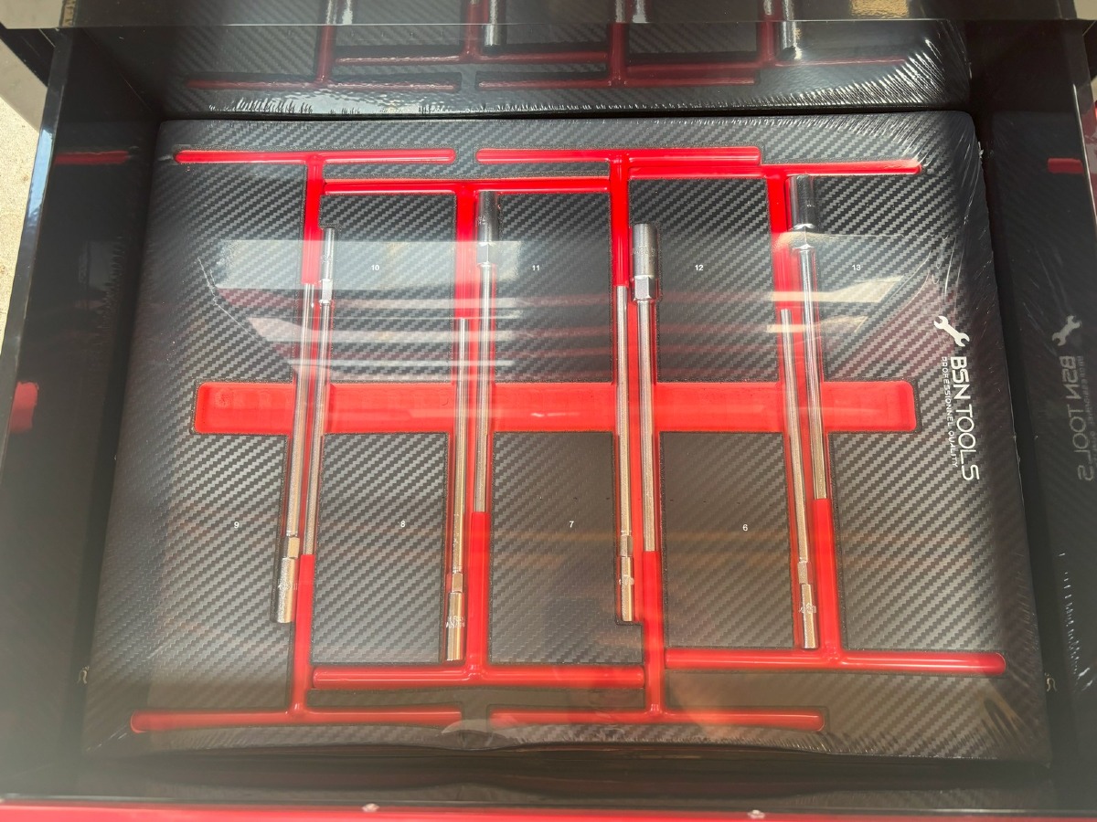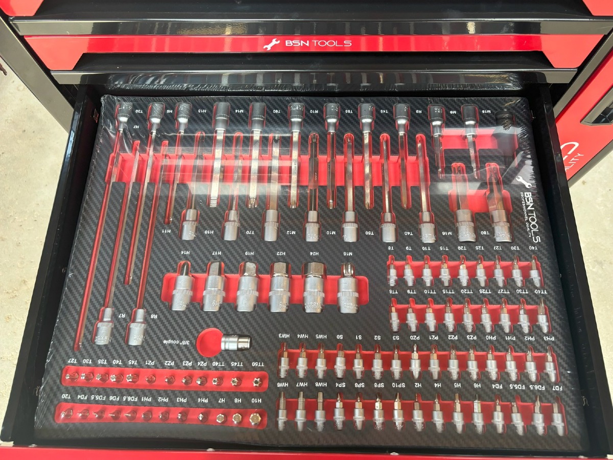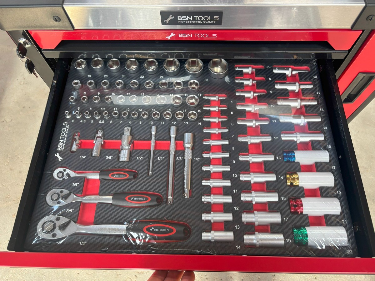 Værktøjsvogn, med masser af værktøj i. Værktøj i alle 7 af skufferne. Der medfølger hjul der kan monteres på den, så den er nem at transportere frem og tilbage - disse ligger i skuffe 7.  Ubrugt og i original emballage. Måler: 79 x 48 x 84 cm.
