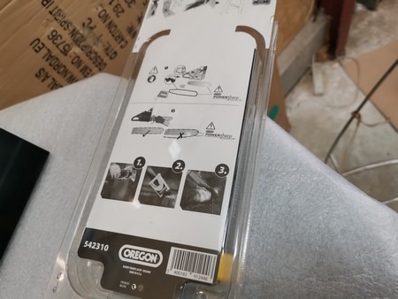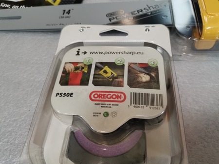OREGON PowerSharp sværd, 2 stk. kæder & 2 stk. slibesten. Slib kæden på saven hurtigere. Man skal blot klemme en lille slibekassette fast på sværdet og køre saven i 3-5 sek. Sværene er 14 tommer og 36 cm. Ubrugt og i original emballage