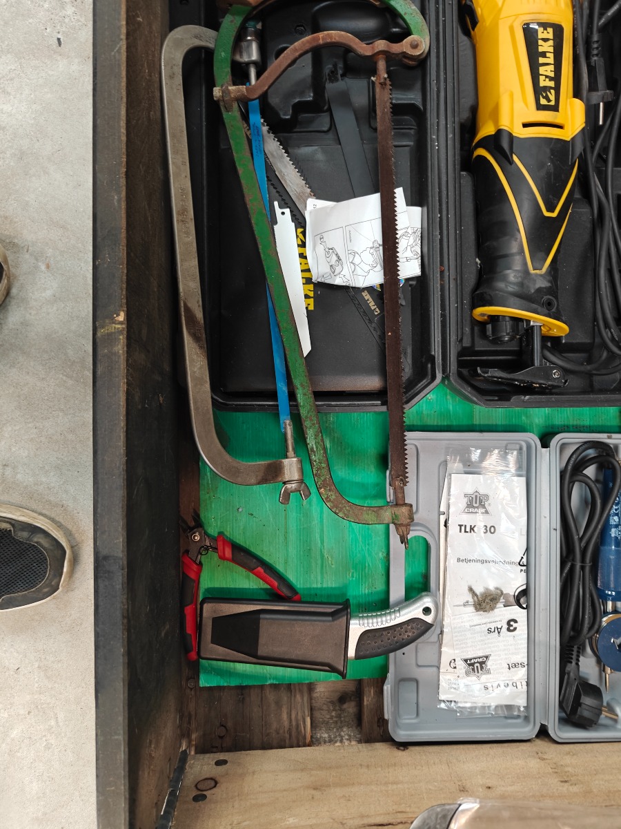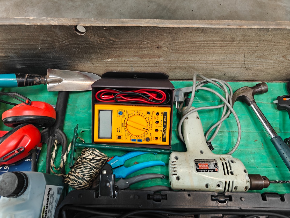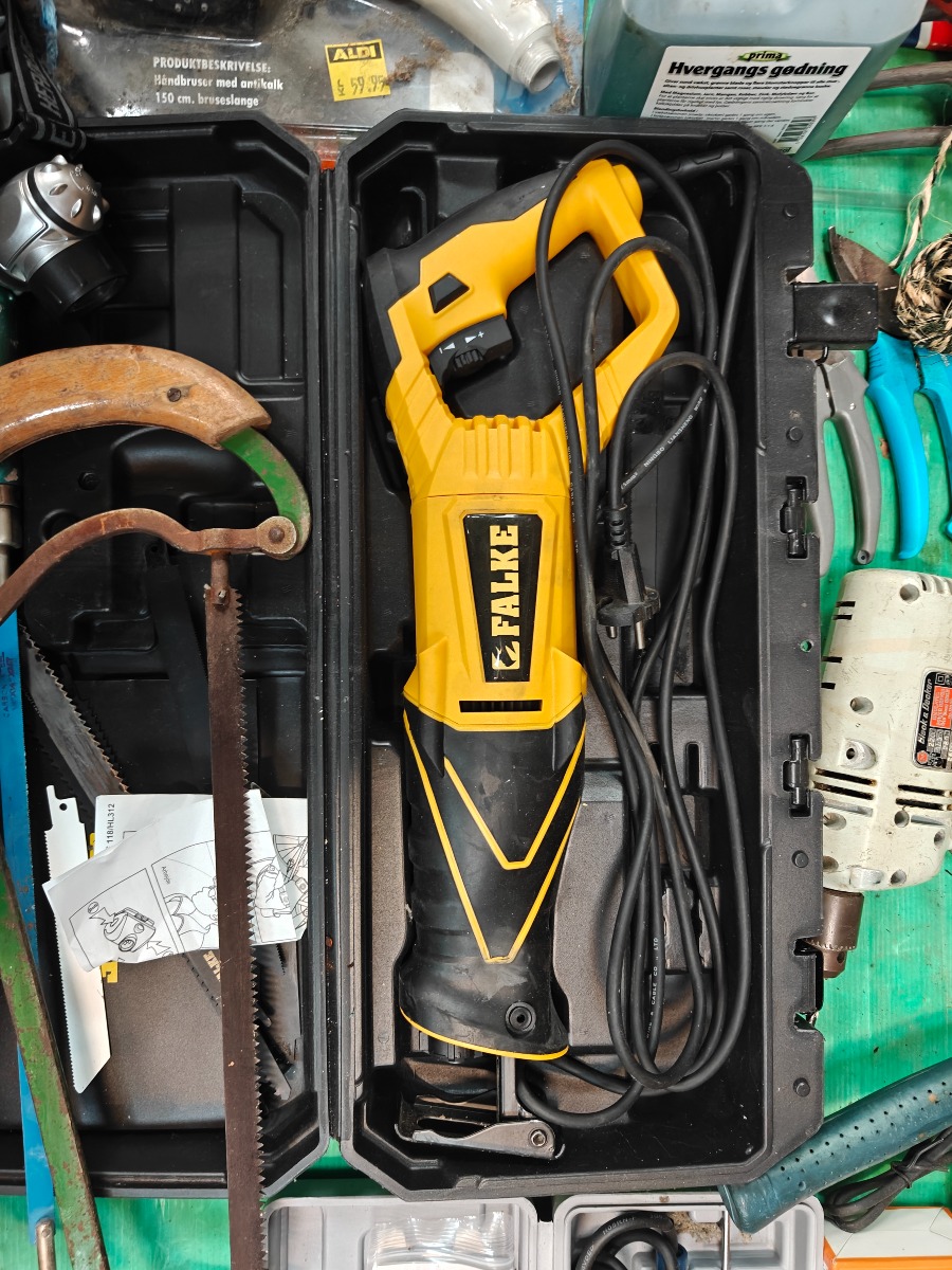 Parti div til have & værksted bla. falke bajonetsav, lille lode kolbe, kraftig grensav & multimeter, brugt