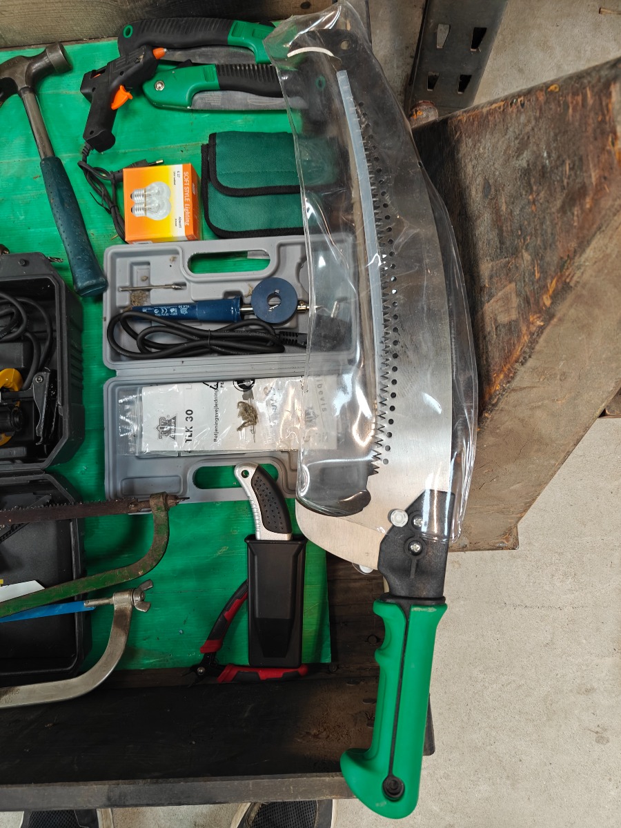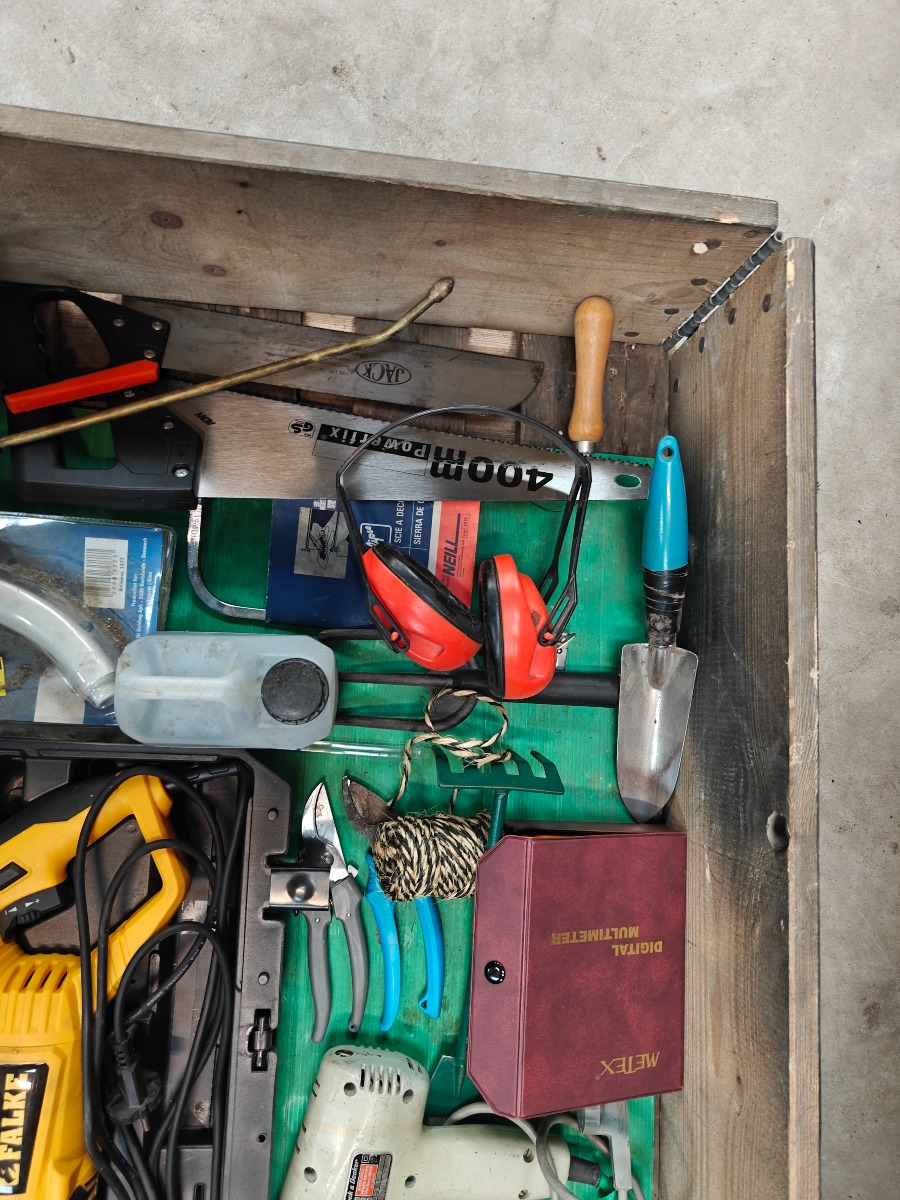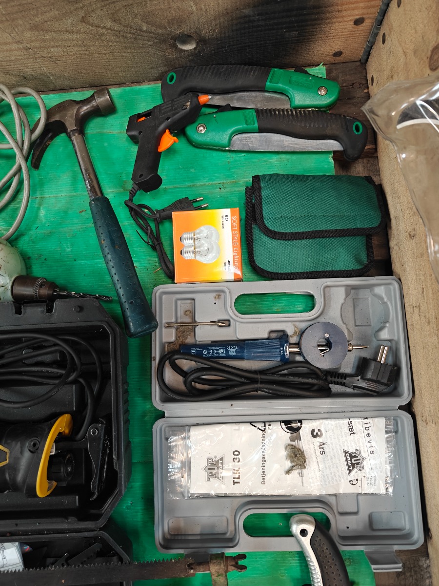 Parti div til have & værksted bla. falke bajonetsav, lille lode kolbe, kraftig grensav & multimeter, brugt