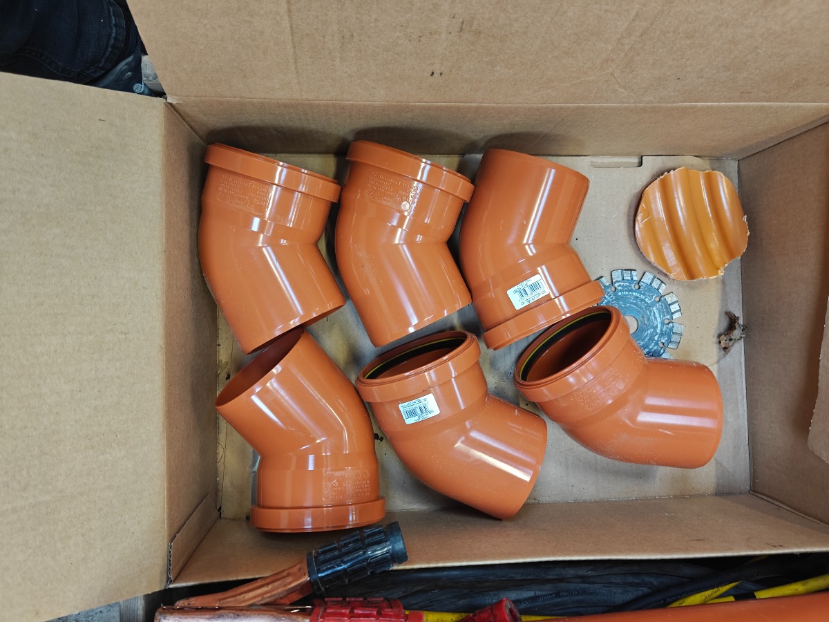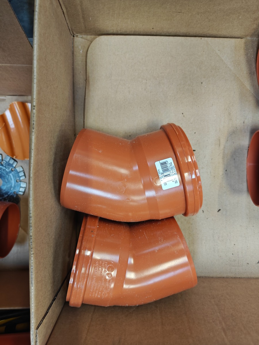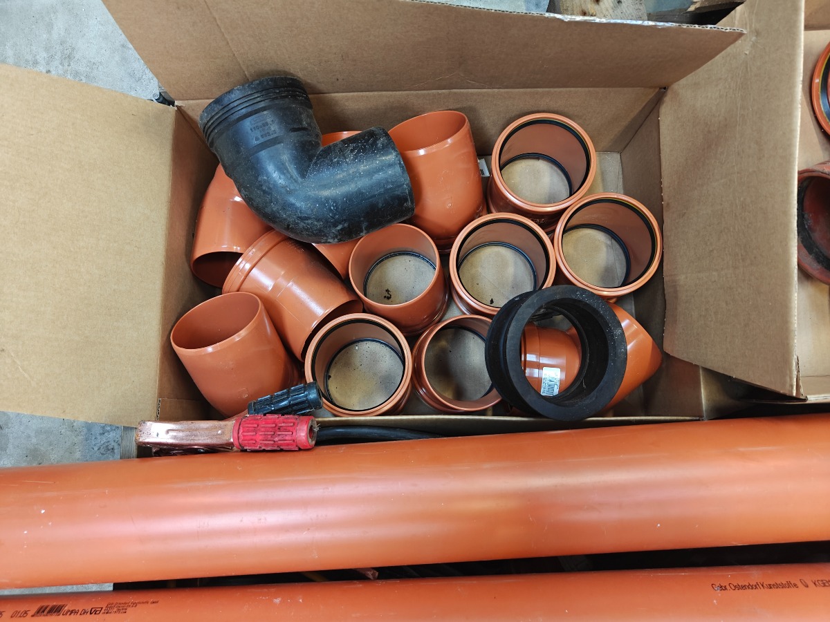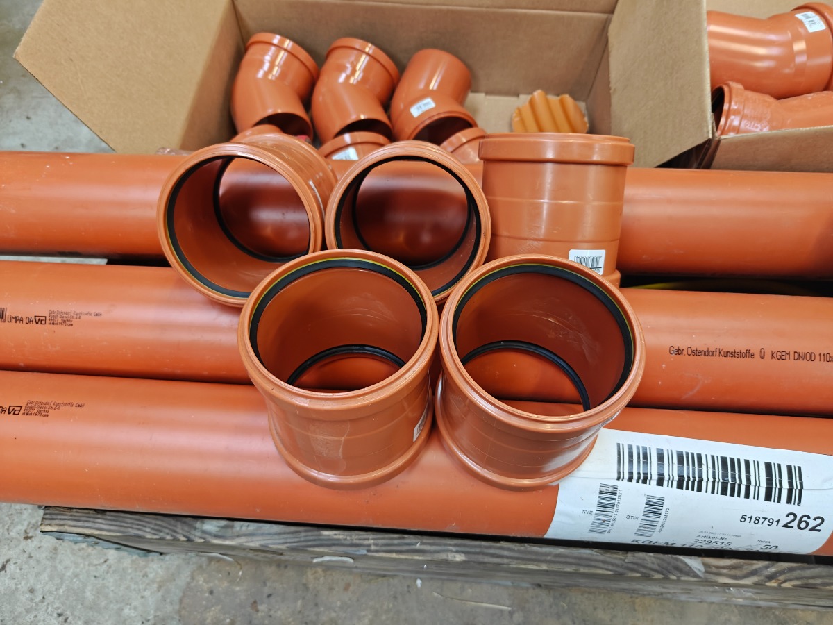 Parti kloark rør & fittings. 3 stk rør 110 x 3,2 x 2000 mm, 6 stk 45gr. bøjning, 2 stk 30 gr. bøjning, 5 stk 15 gr. bøjning & 5 stk muffer alt i 110 mm