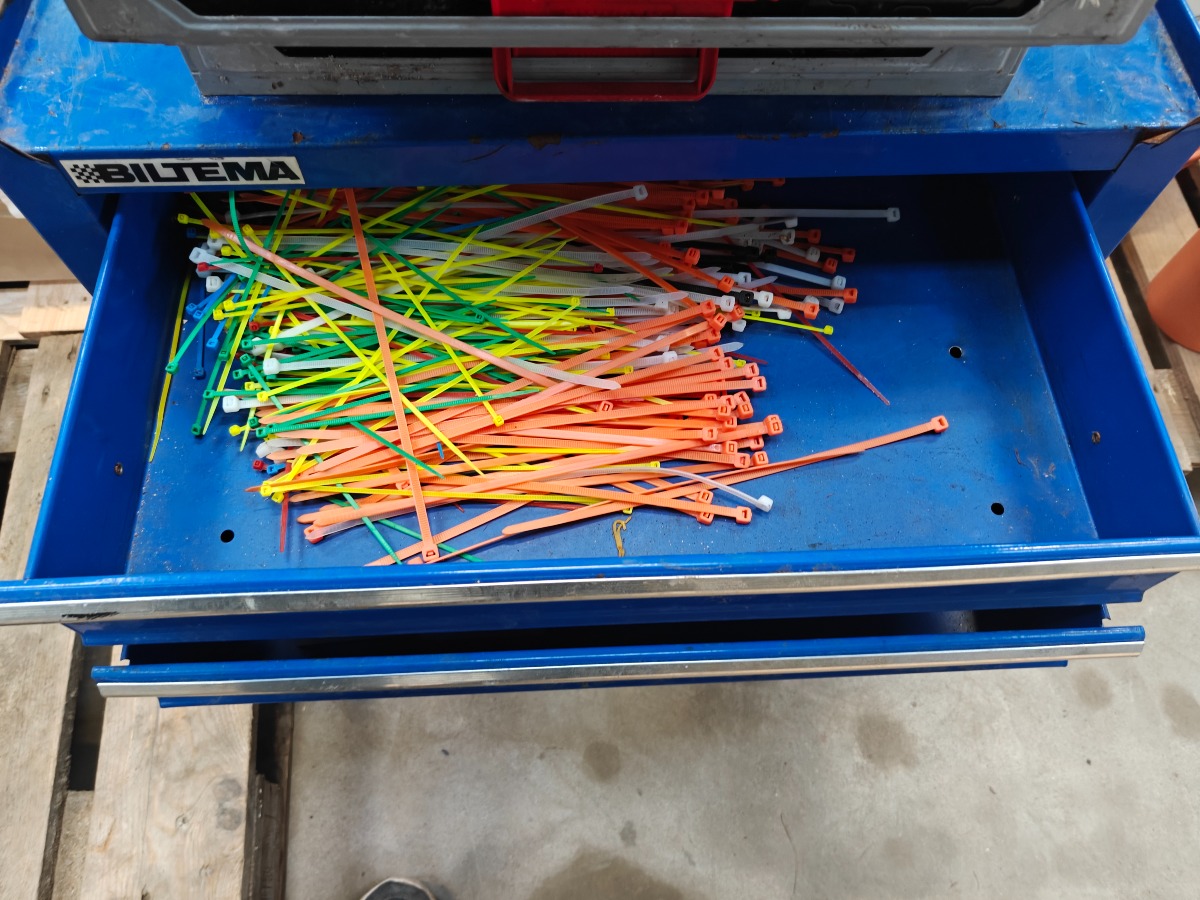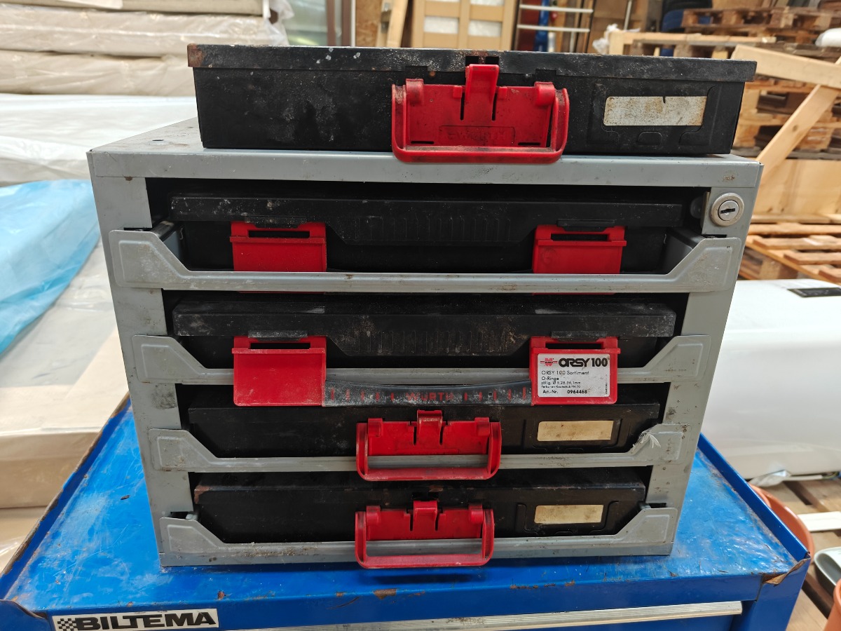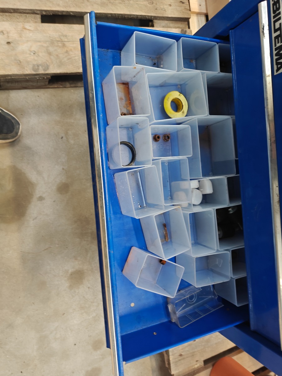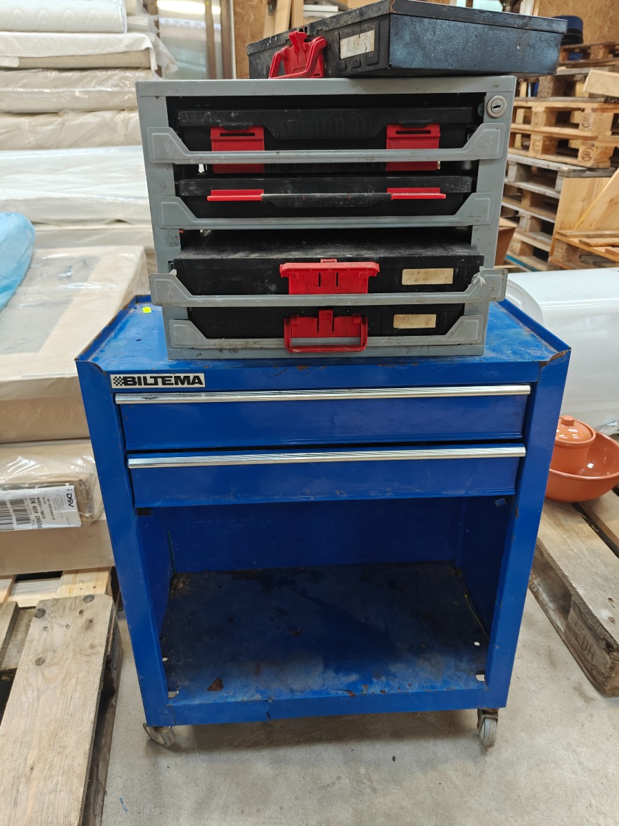 Værktøjsvogn fra biltema den ene hjul skal skiftes, orsy systemskab m. kufferter (tomme) & lagerkasser 5 stk 59 x 24 cm & 59 x 12 cm