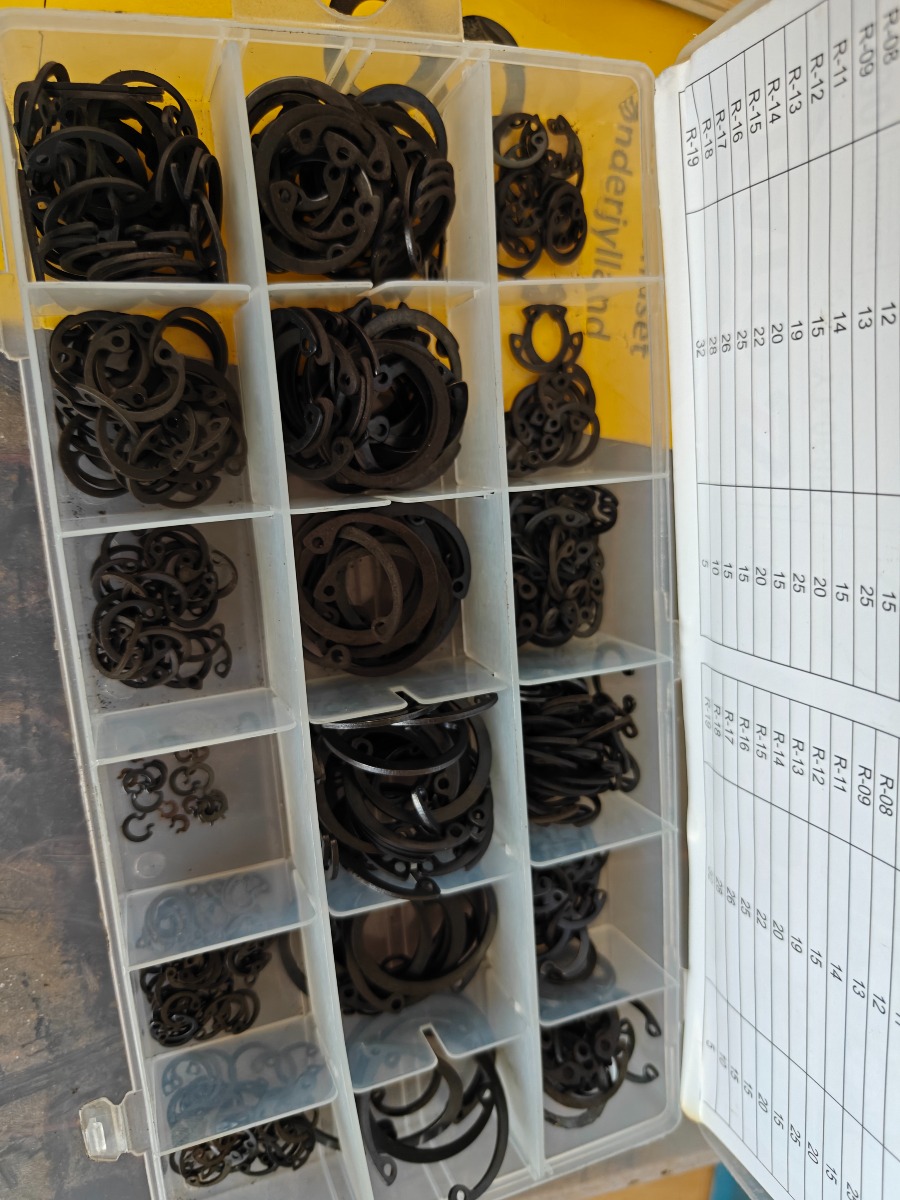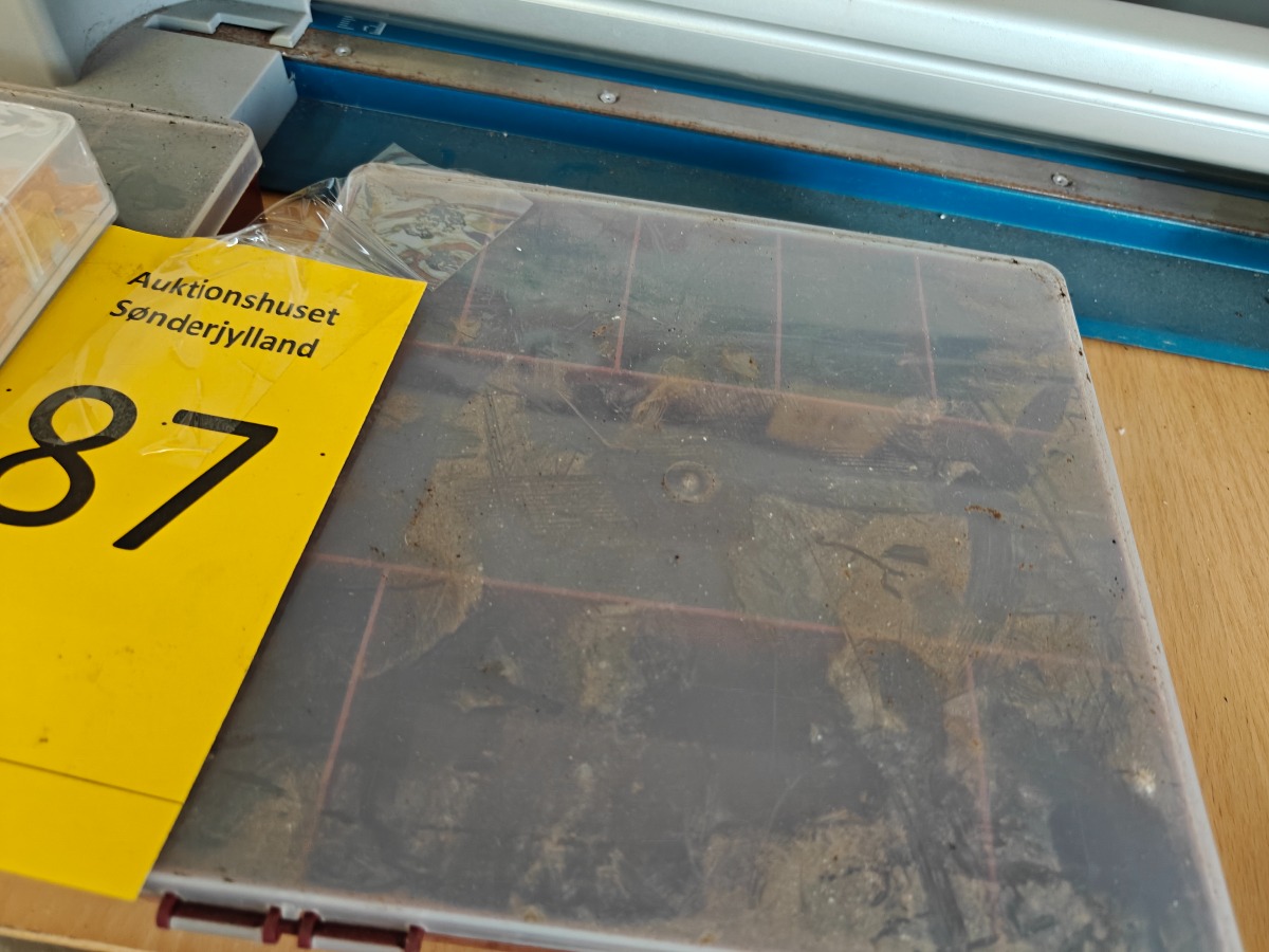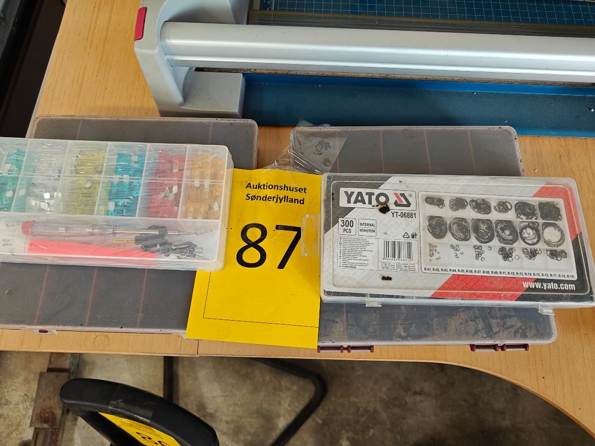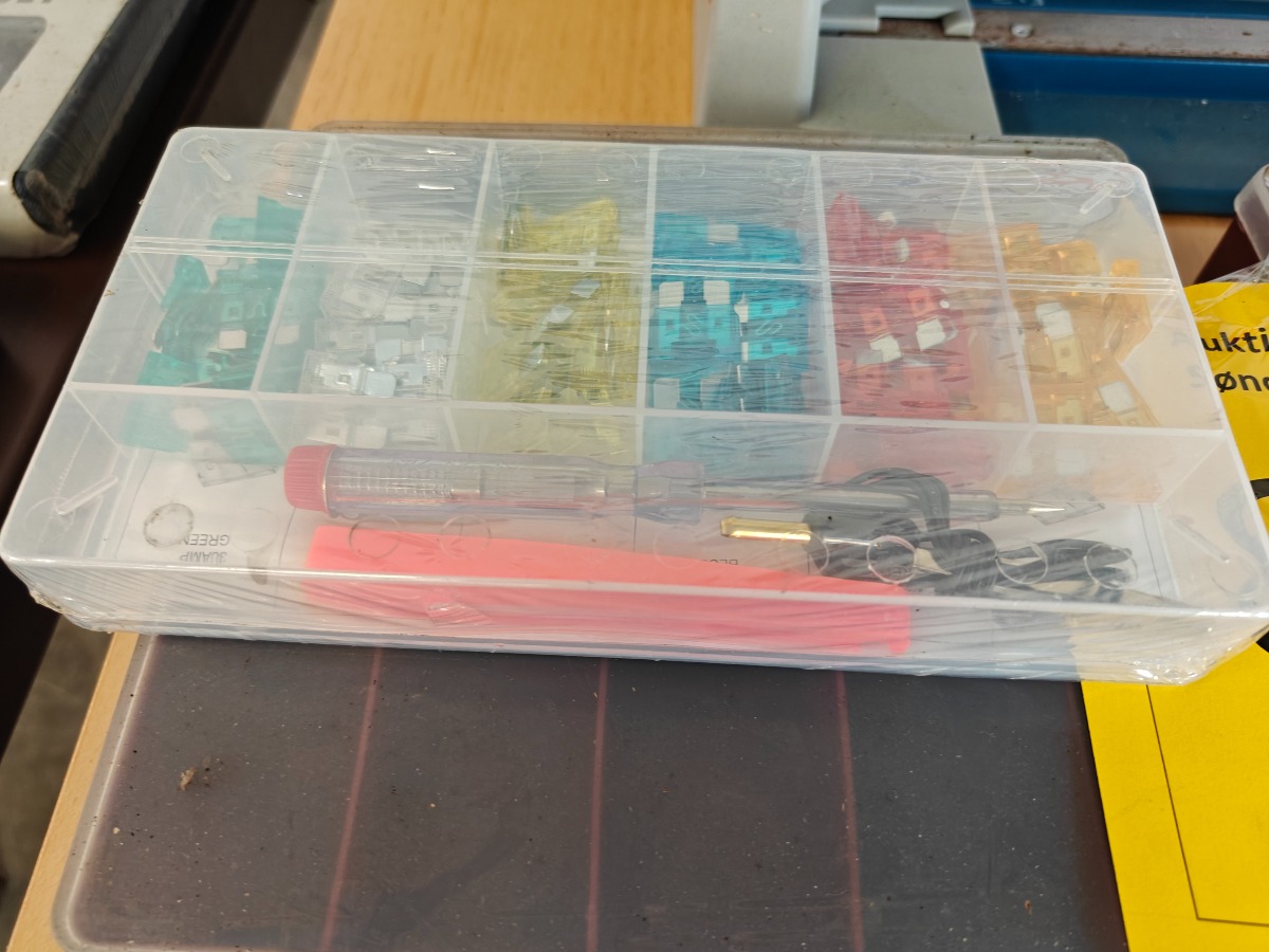 Kasse med låseringe, kasse med standardsikringer i forskellige ampere-størrelser, samt 2 stk. tomme sortement kasser.