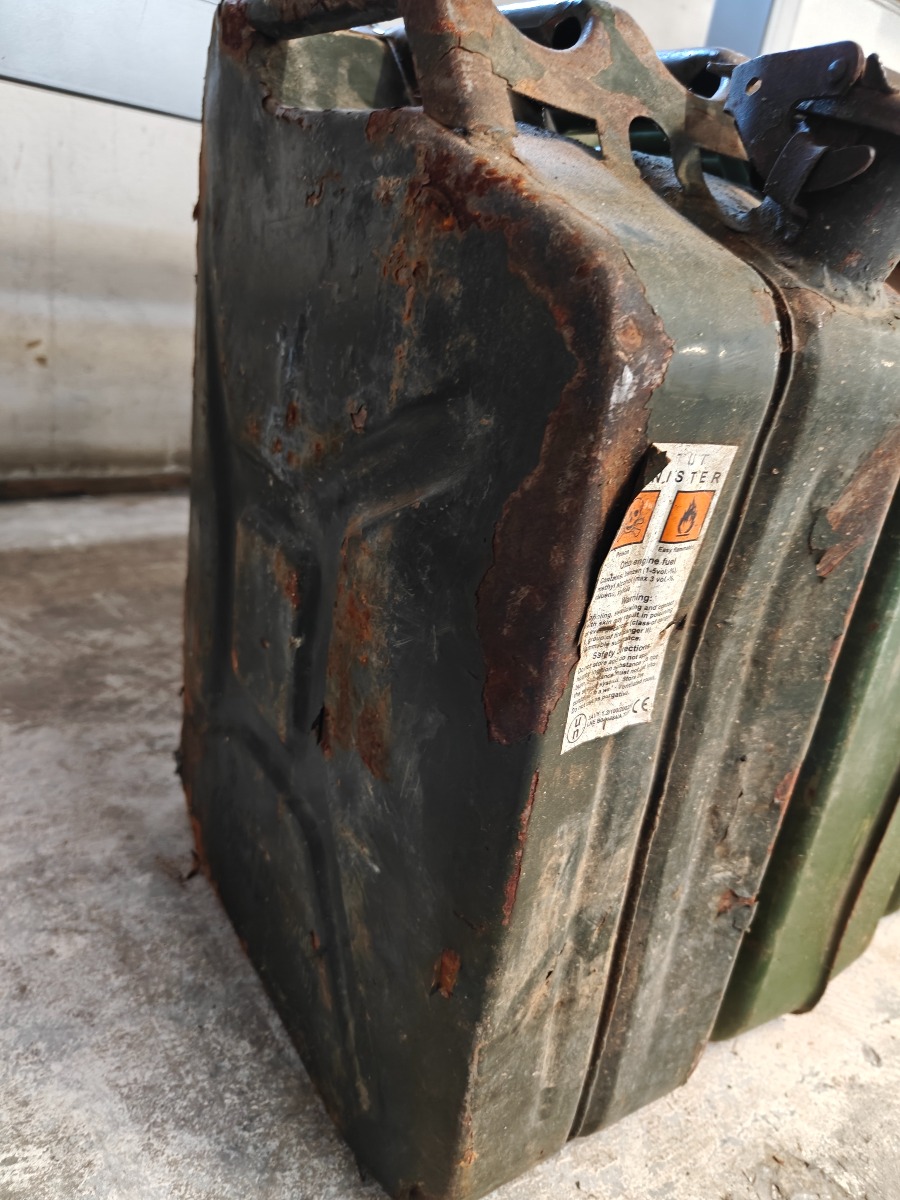 3 stk. ældre jerrycans - den ene med en hel del rust.