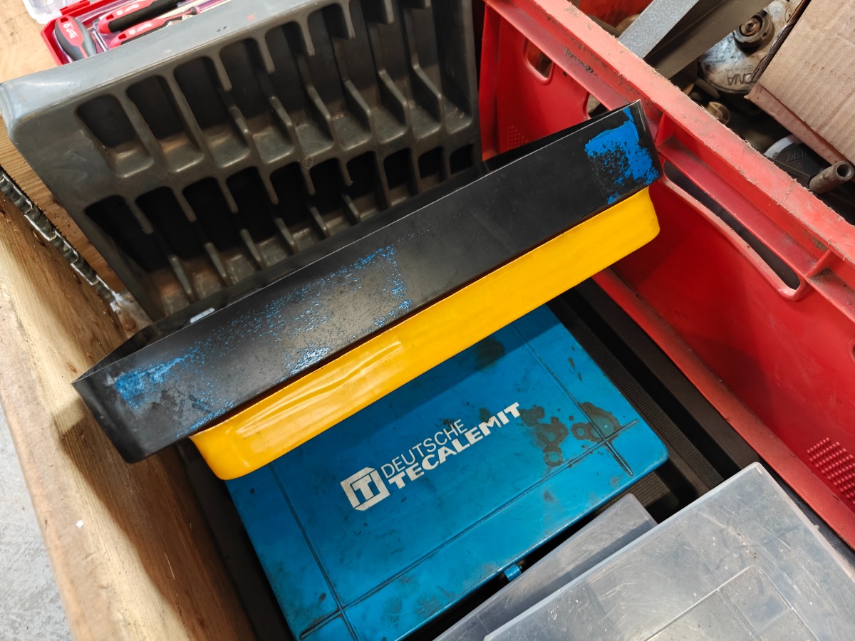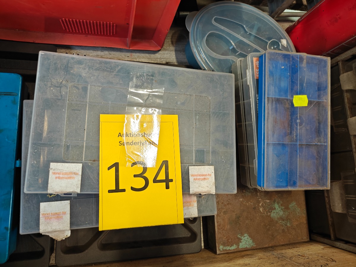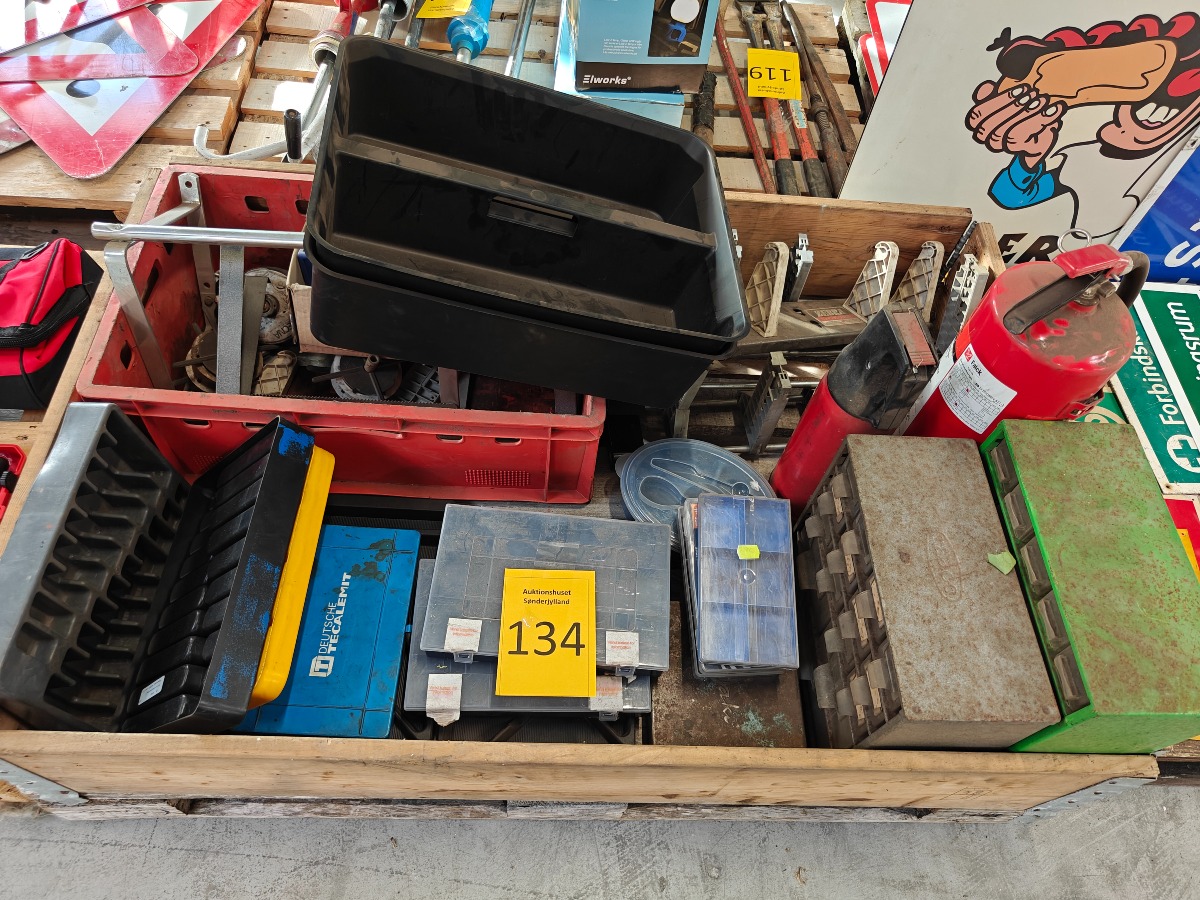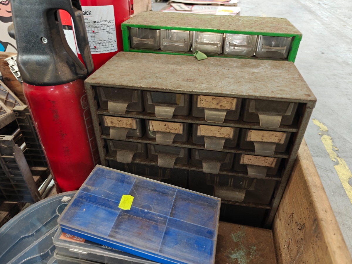 Diverse værkstedsudstyr - sortimentskasser, brændslukker, kasse mm. Brugt.