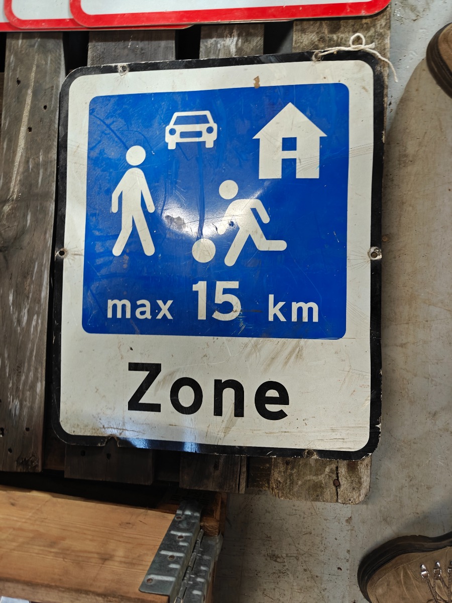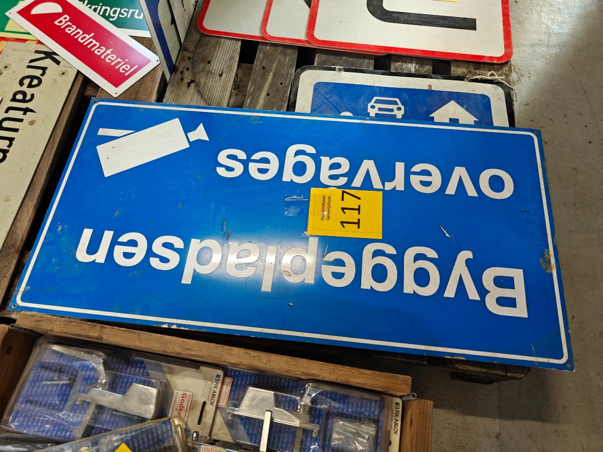 2 stk. skilte - "Byggepladsen overvåges" og "max 15 km. Zone". Brugt.