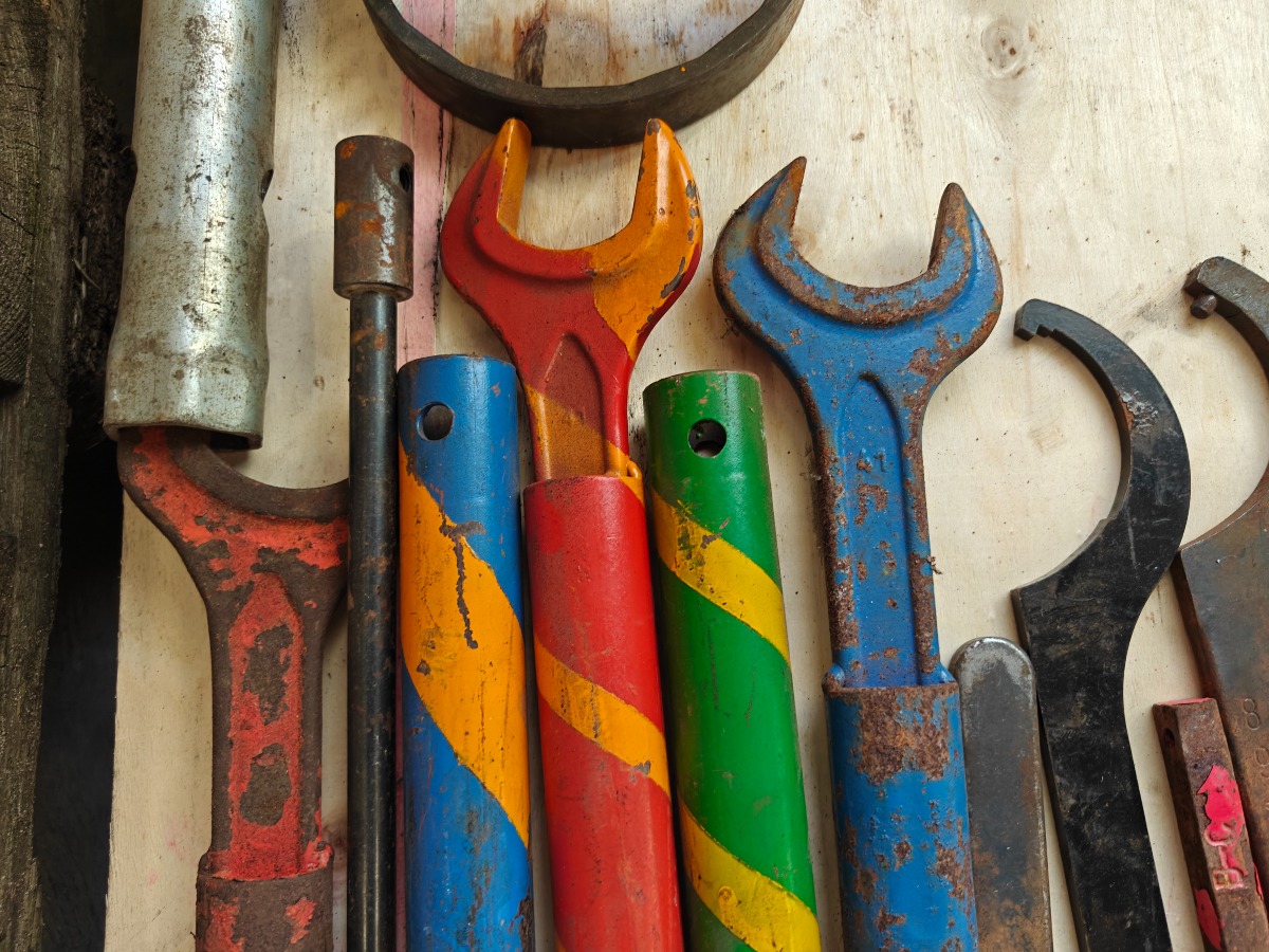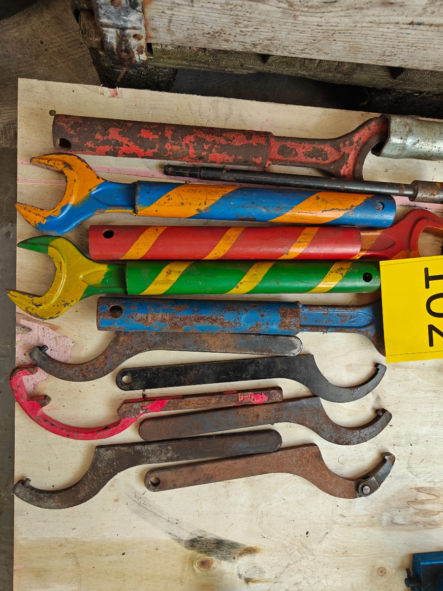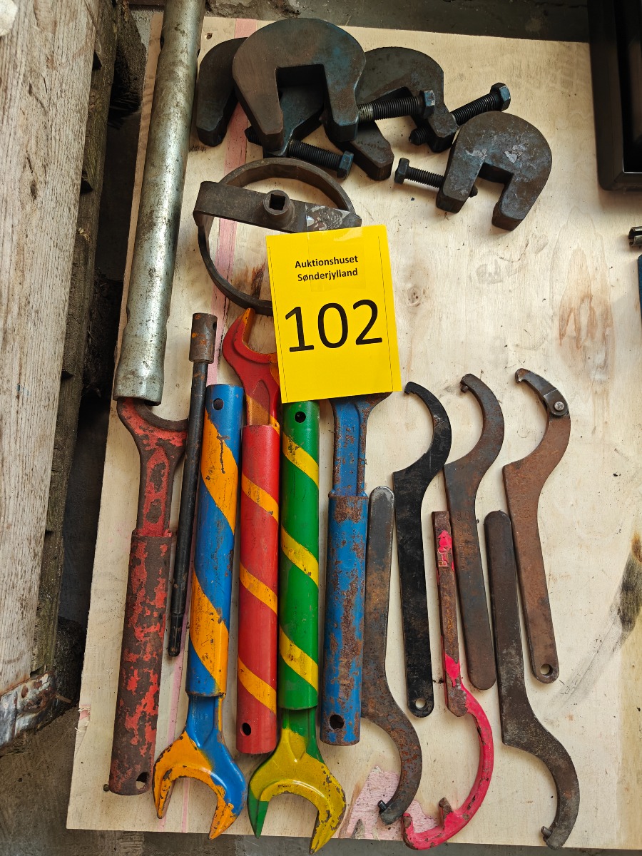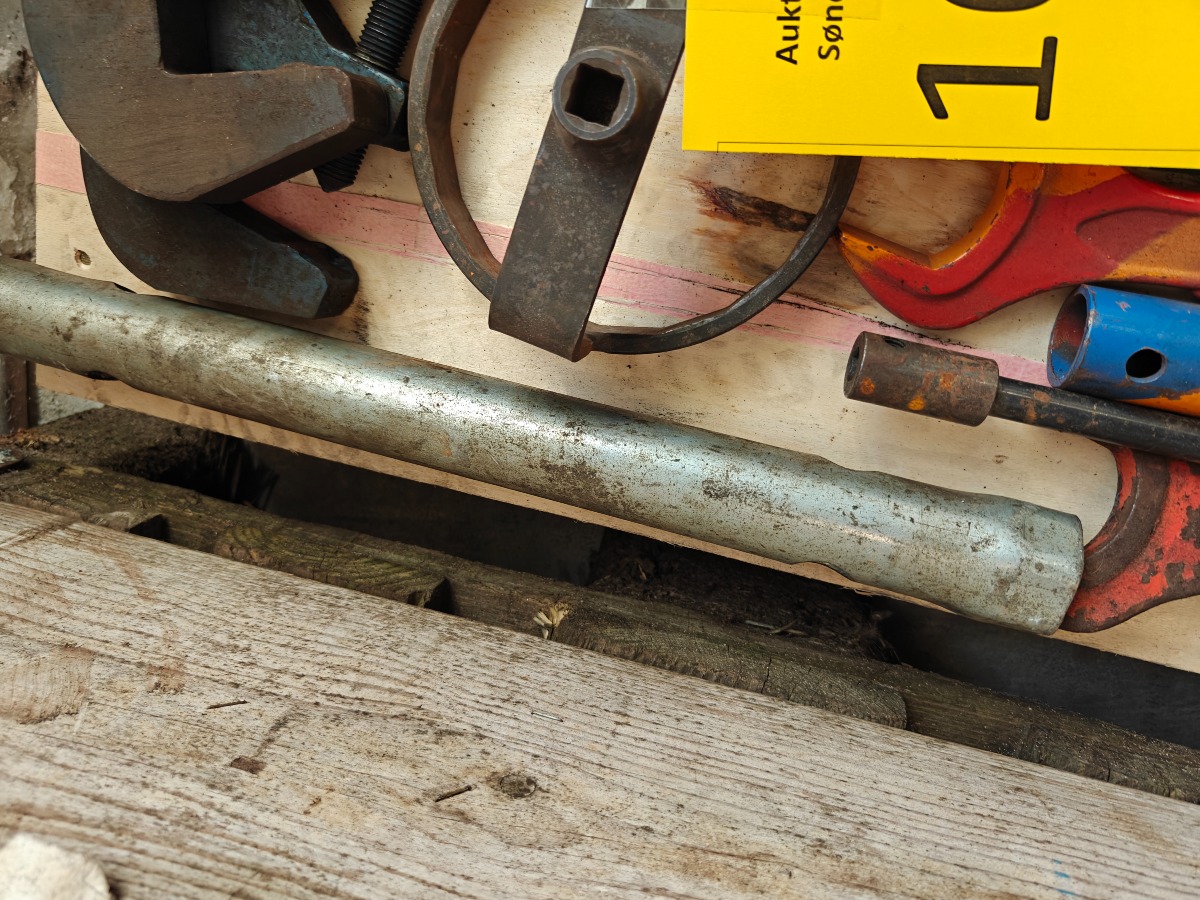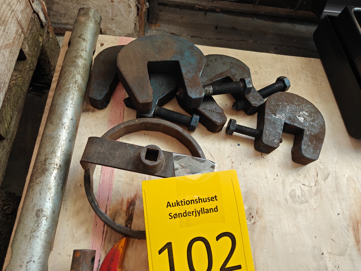Diverse værktøj - C-klemmer, gaffelnøgler og krognøgler, metalstang mm. Brugt.