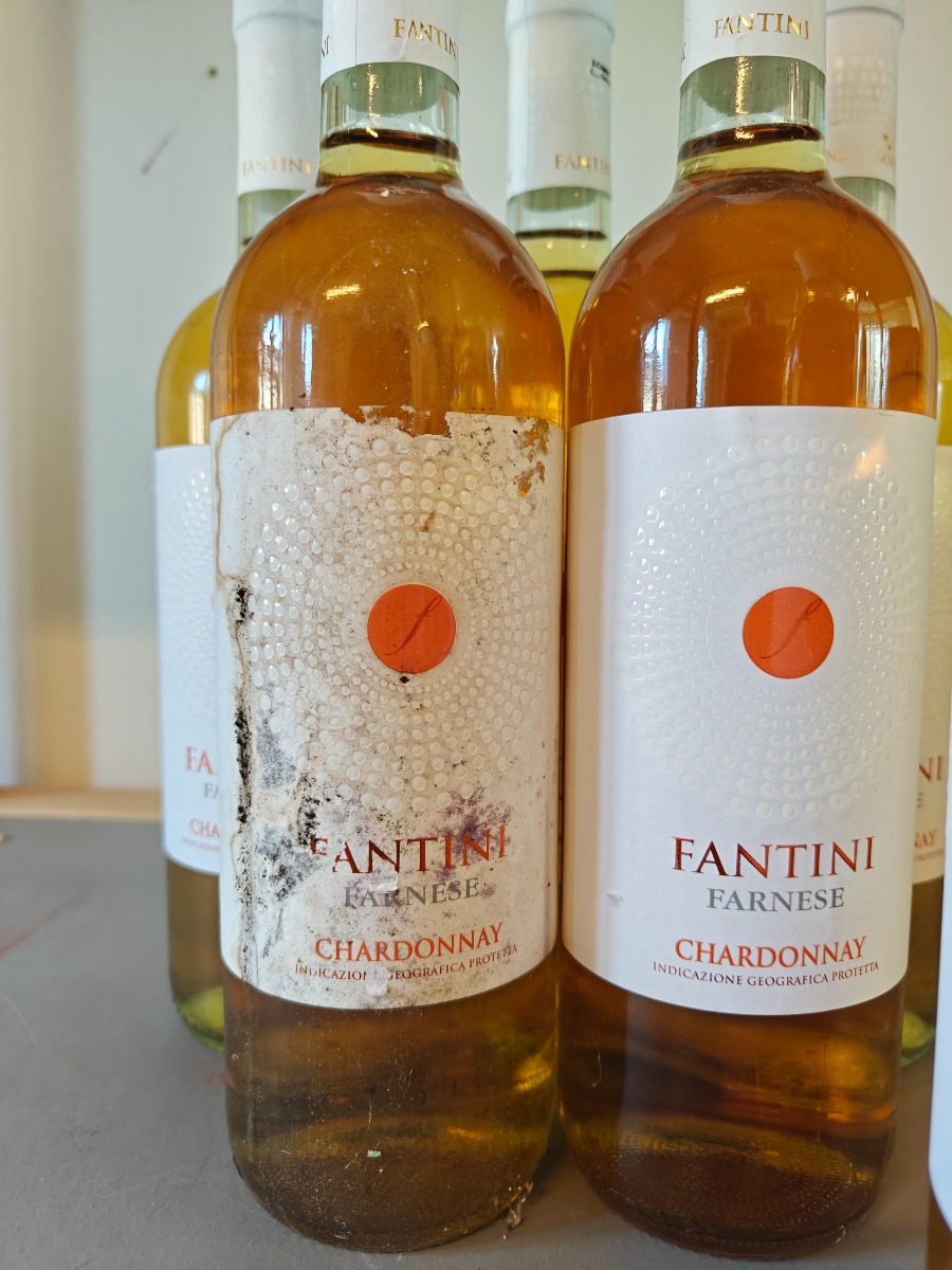 6 fl. Fantini Farnese Chardonnay 2015. 1 flaske med vandskadet etiket.