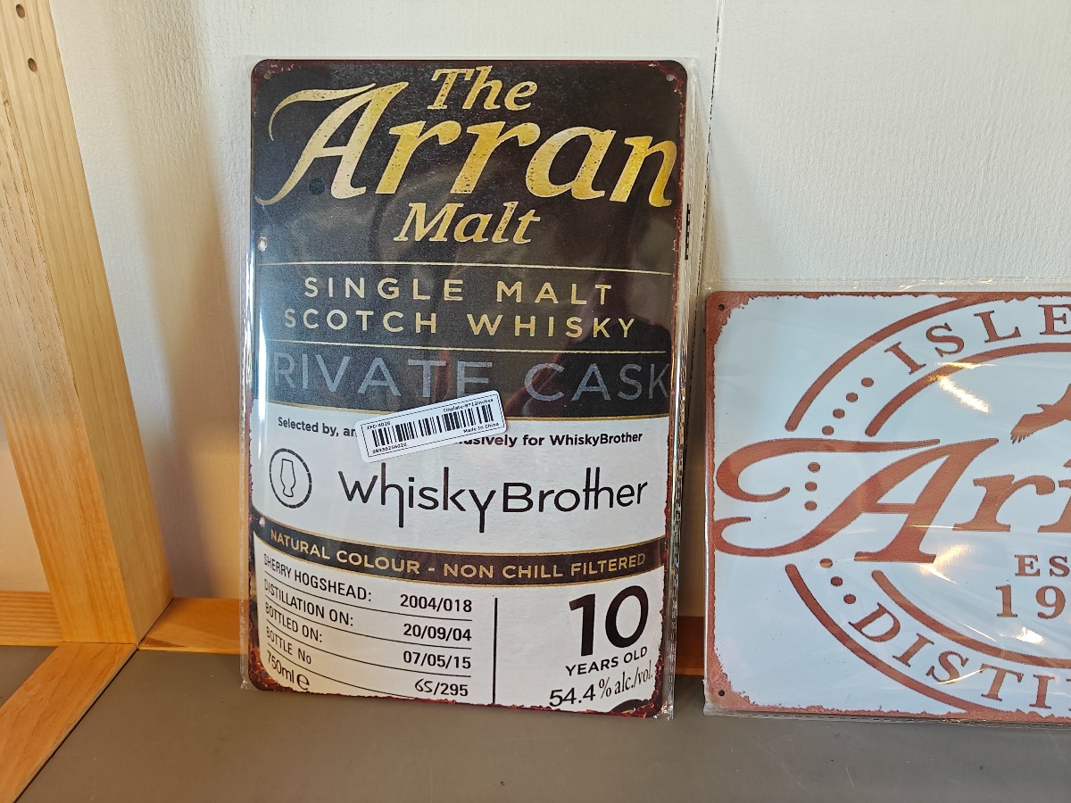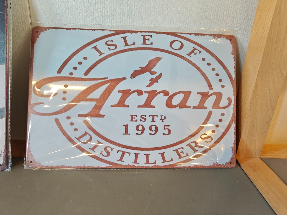 The Arran Malt 10 års single og Black Velvet Blended. Hertil 2 nyere metalskilte med Arran Whisky motiver.