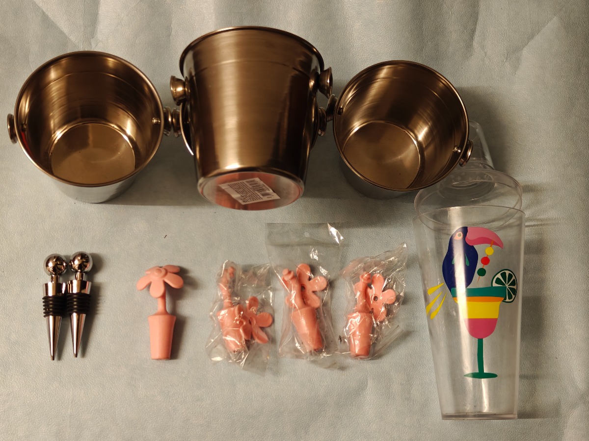 4 stk. små isspande, 1 stk. drinksshaker & 6 stk. vinpropper. Ubrugte.