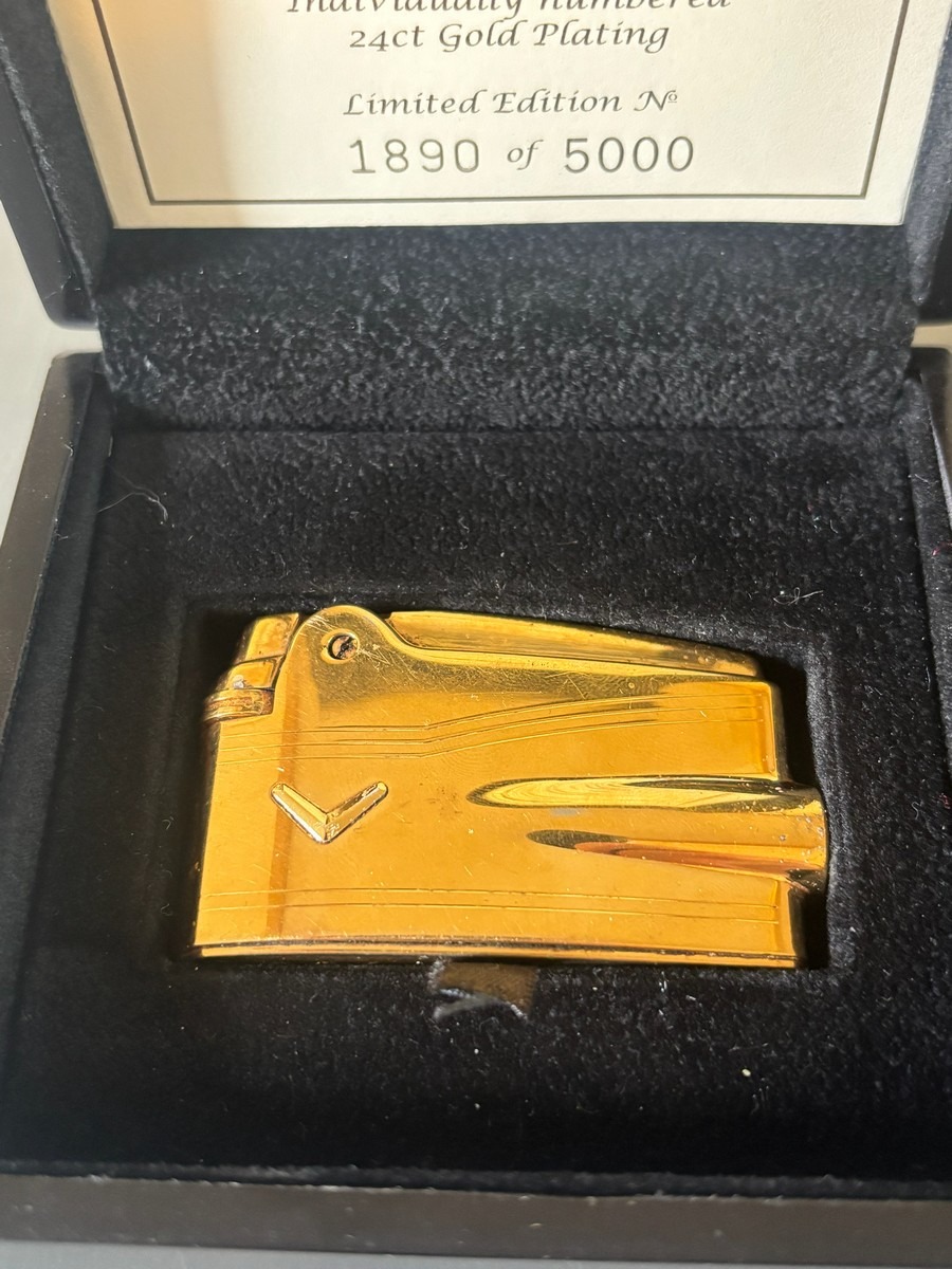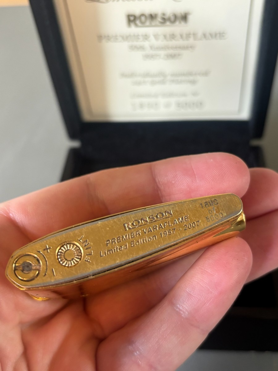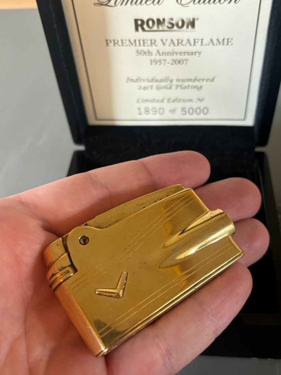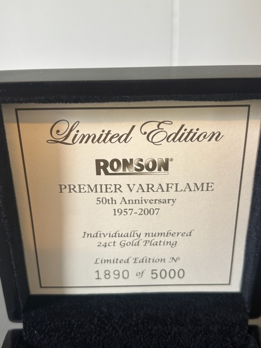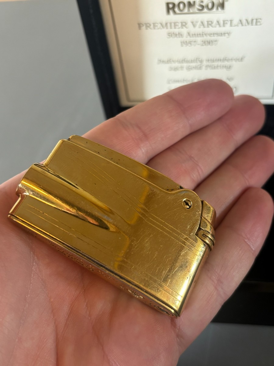 Ronson Premier Varaflame. Nummereret jubilæumsmodel 1957 - 2007. Model forgyldt med 24 kt. guld. Nr. 1890/5000. Original opbevaringsæske med certifikat. Fremstår med slid på forgyldning. Stammer fra dødsbo.