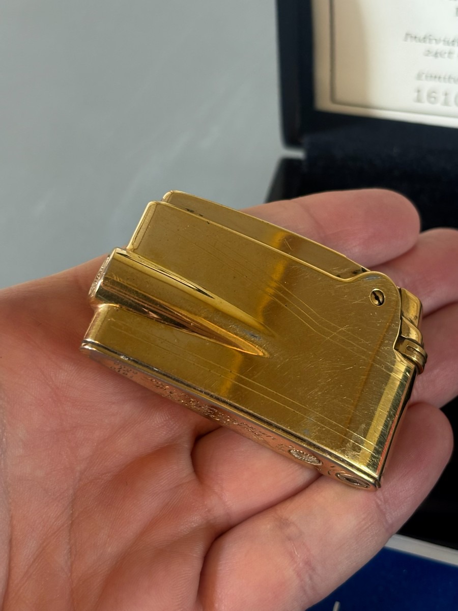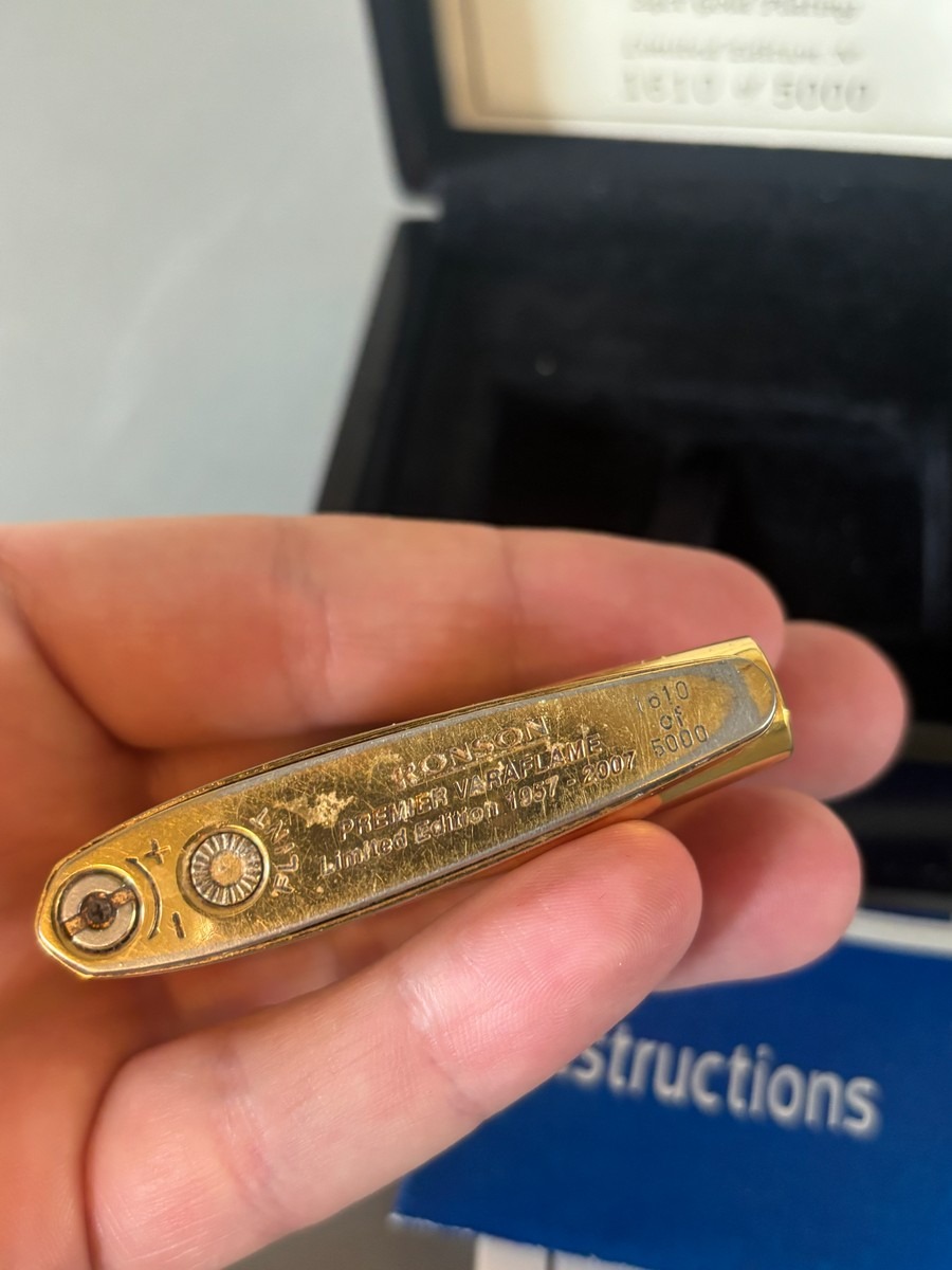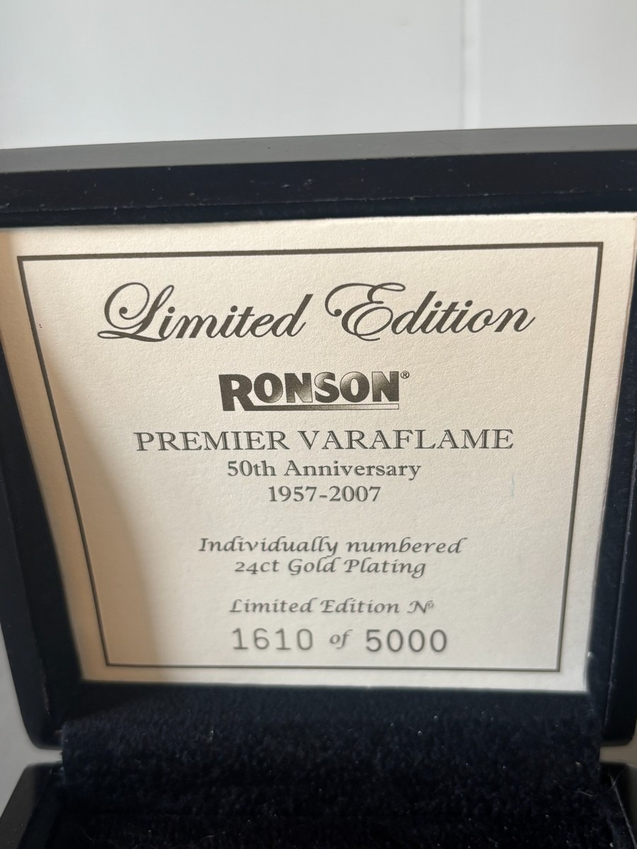 Ronson Premier Varaflame. Nummereret jubilæumsmodel 1957 - 2007. Model forgyldt med 24 kt. guld. Nr. 1610/5000. Original opbevaringsæske med certifikat. Fremstår med slid på forgyldning. Stammer fra dødsbo.