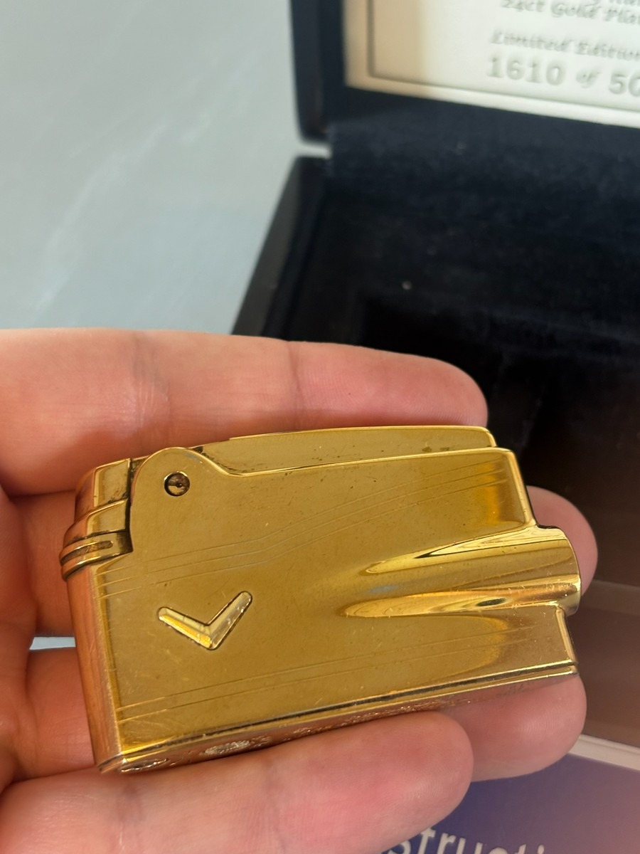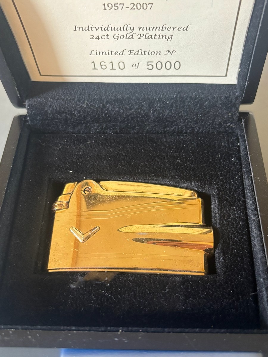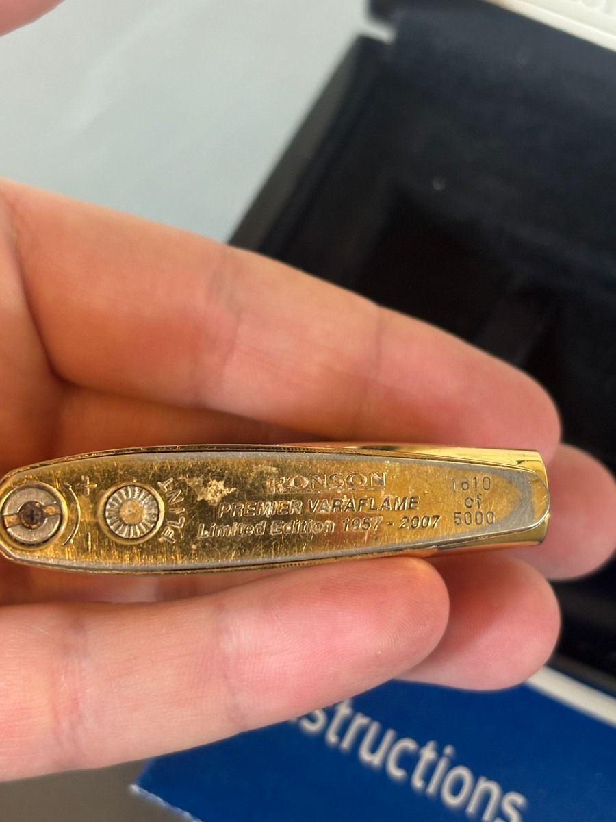 Ronson Premier Varaflame. Nummereret jubilæumsmodel 1957 - 2007. Model forgyldt med 24 kt. guld. Nr. 1610/5000. Original opbevaringsæske med certifikat. Fremstår med slid på forgyldning. Stammer fra dødsbo.