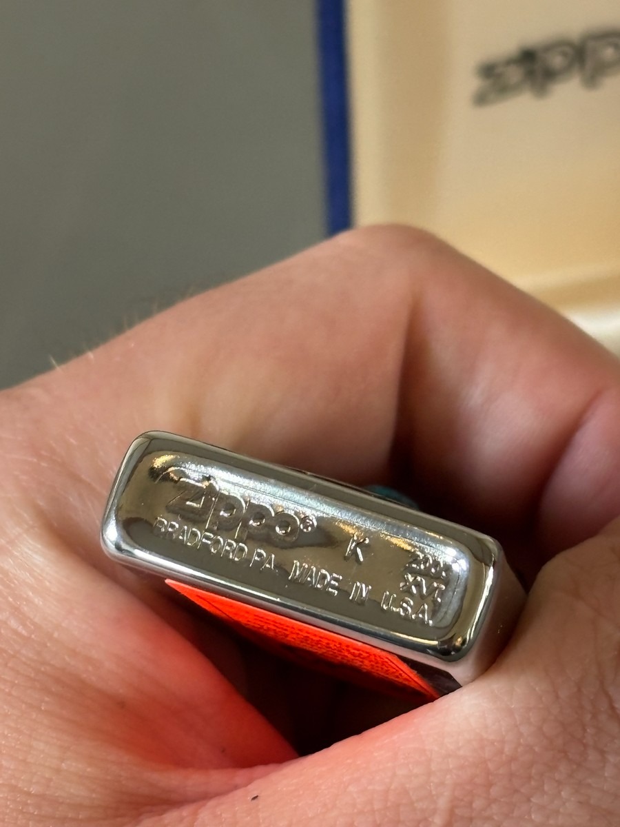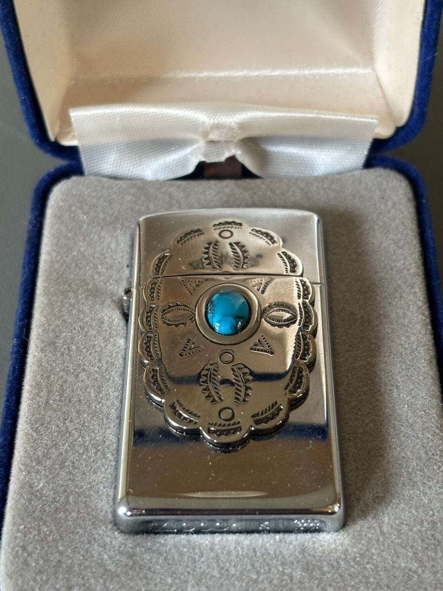 Zippo med turkis. Original æske. Stammer fra dødsbo.