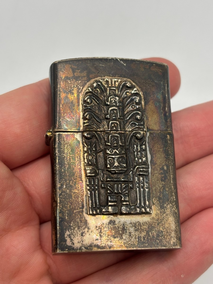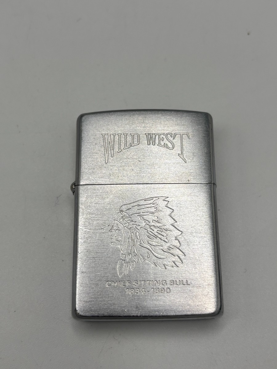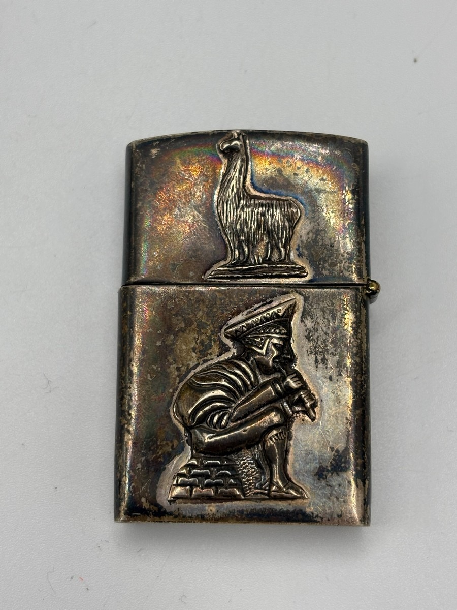 Zippo Wild West Sitting Bull 1834-1890 og 100 år for John Wayne. Denne med ubrudt label. Hertil unavngiven lighter med inkamotiv. Stemplet 925. Stammer fra dødsbo.