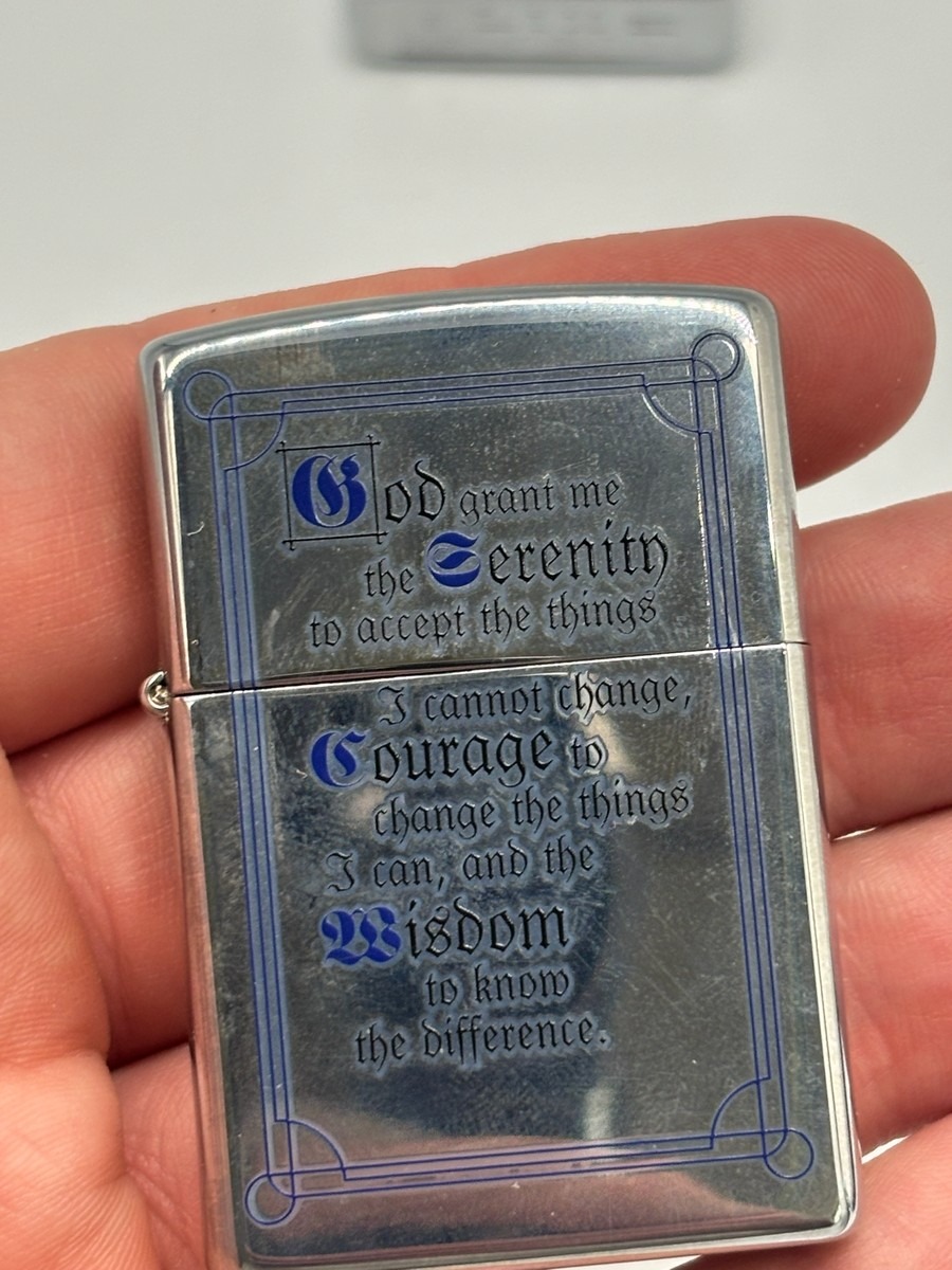 Zippo med forskellige motiver. Lighter med serenety bønen er med ubrudt label.