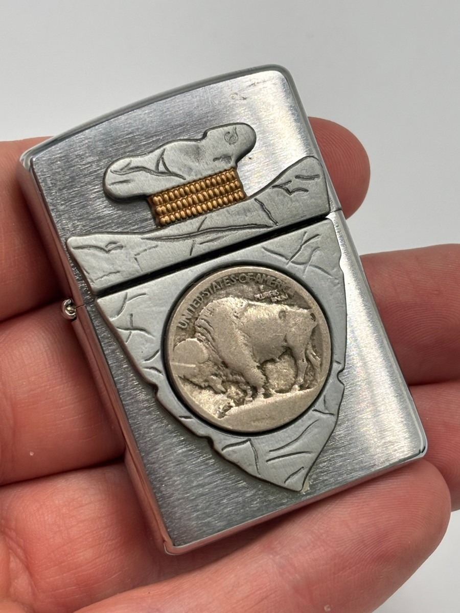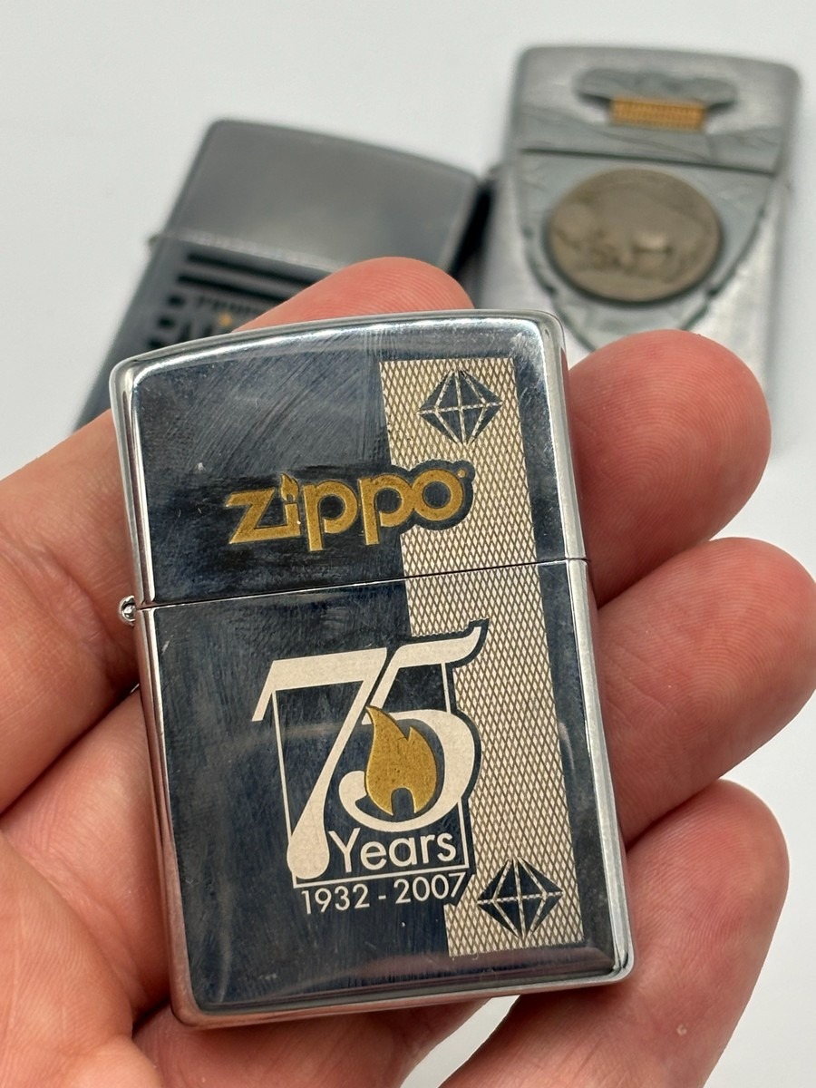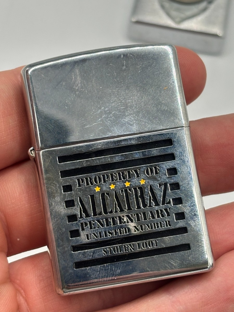 Zippo 75 år 1932-2007 og model med Property of Alcatraz. Begge med  ubrudt label. 1 med monteret Buffalo nickel og ejernavn indgraveret. Fra dødsbo.