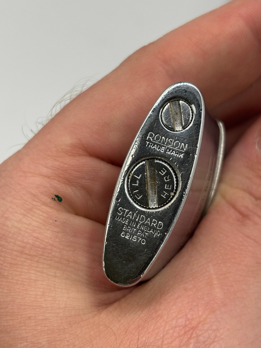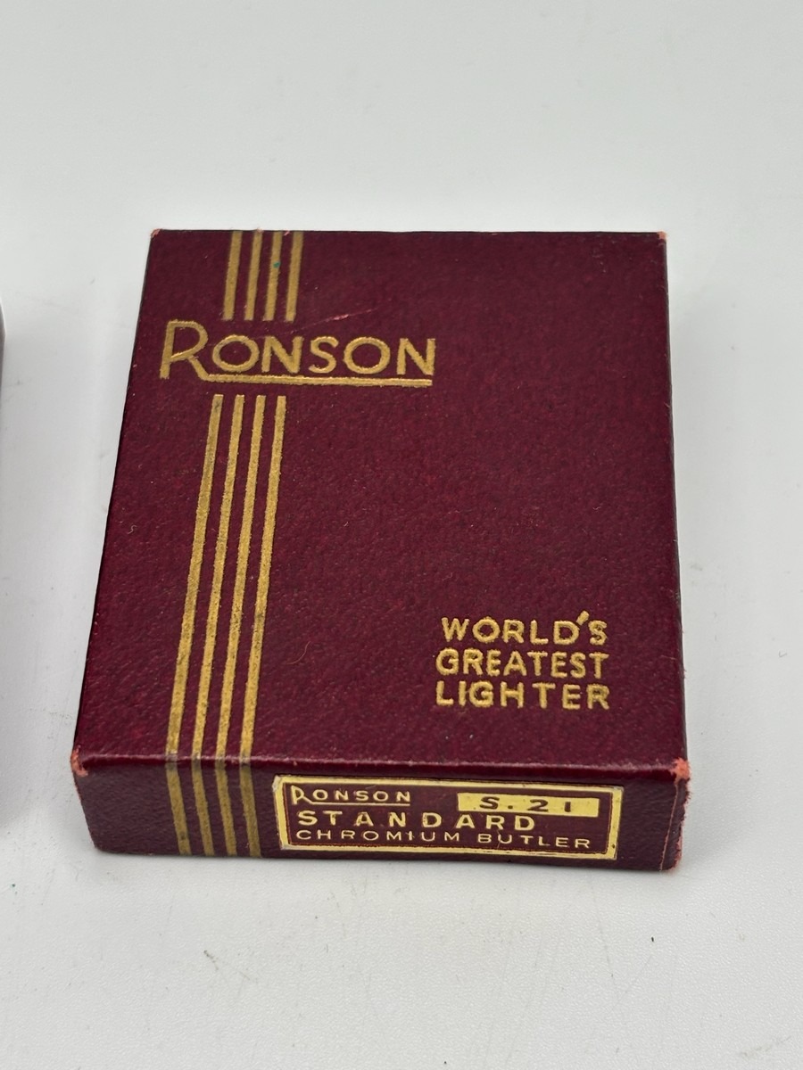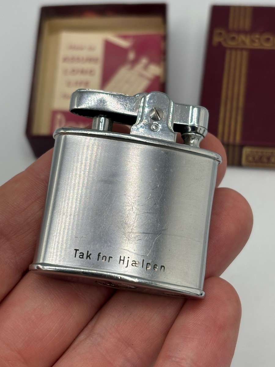 Ronson lighter med æske. Indgraveret ejernavn og dedikation. Fra dødsbo