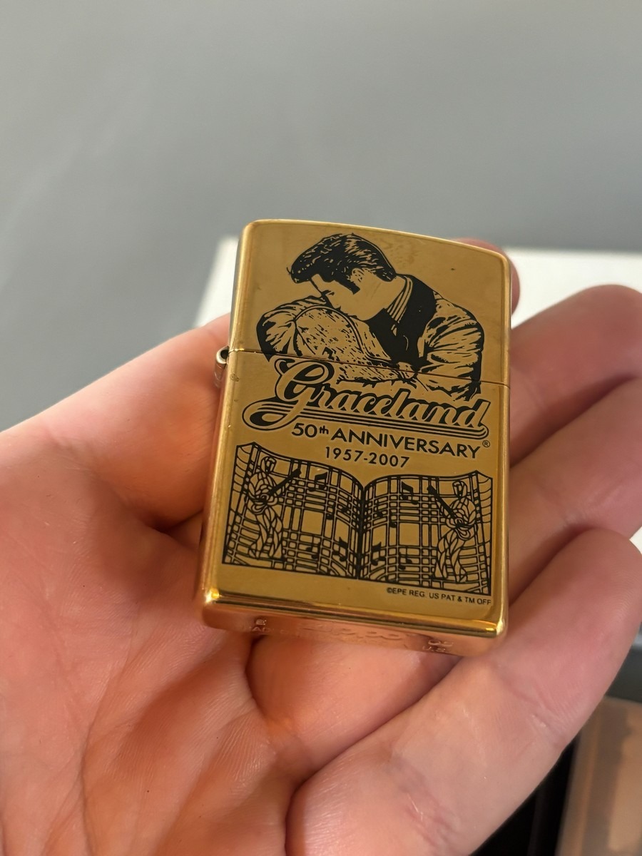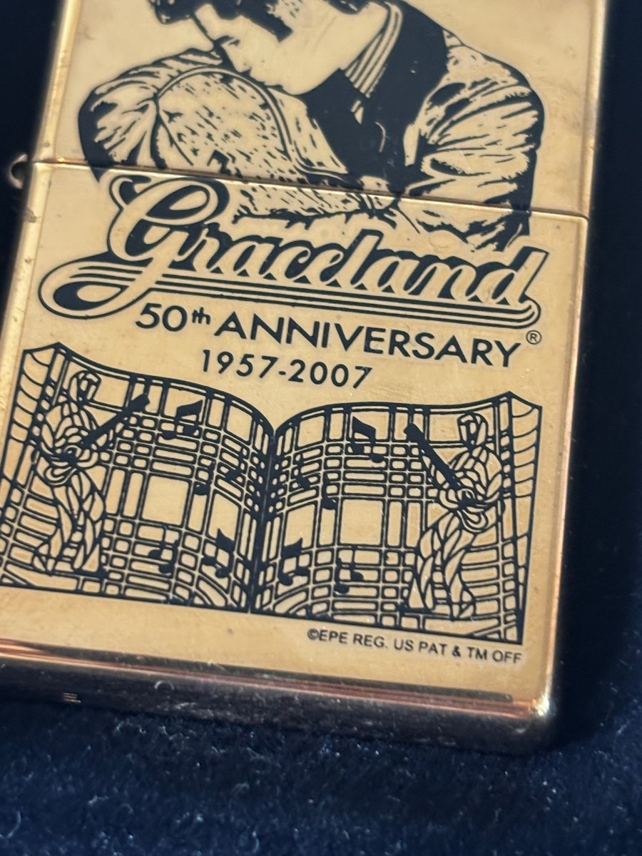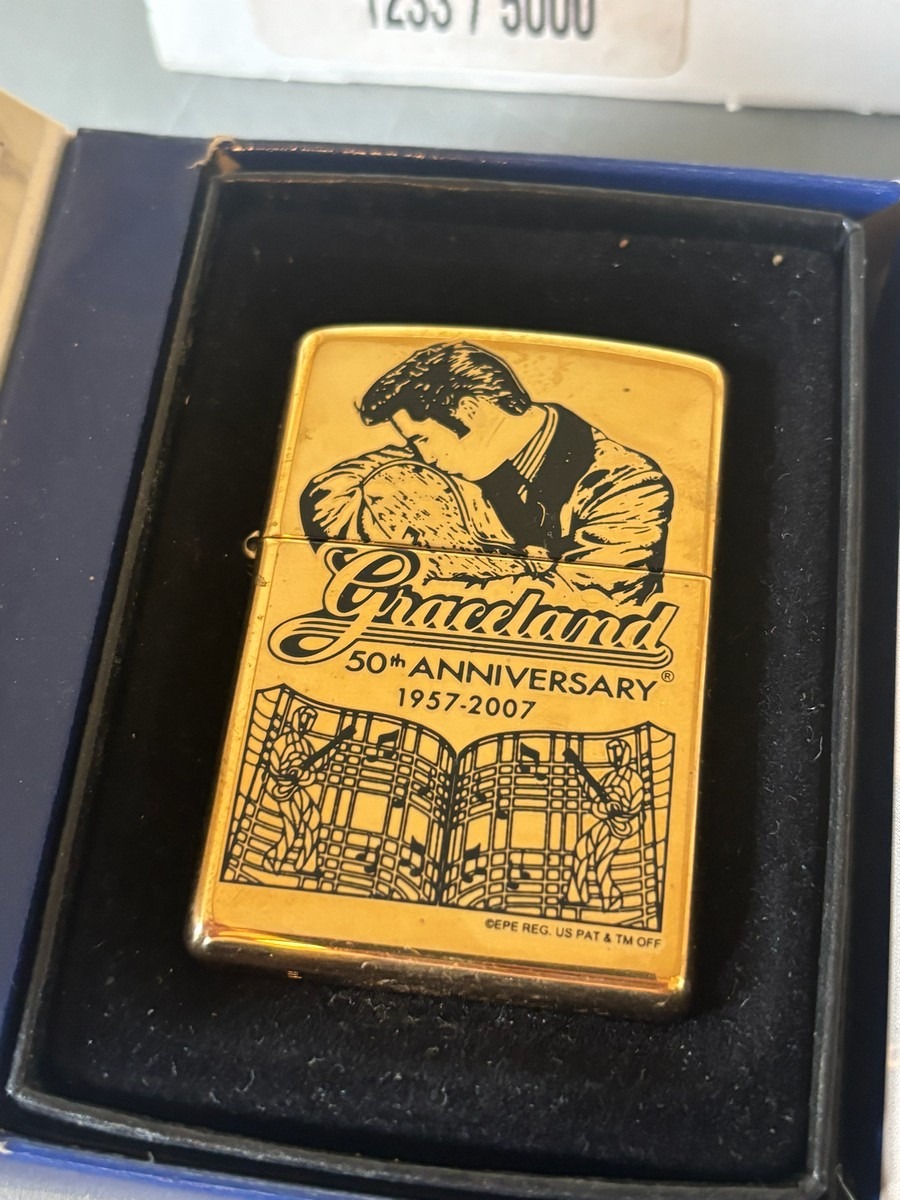 Zippo Graceland 50 år. 1957-2007. Forgyldt og nummereret 1233/5000. Varen er med ubrudt label. Original æske medfølger. Stammer fra dødsbo.